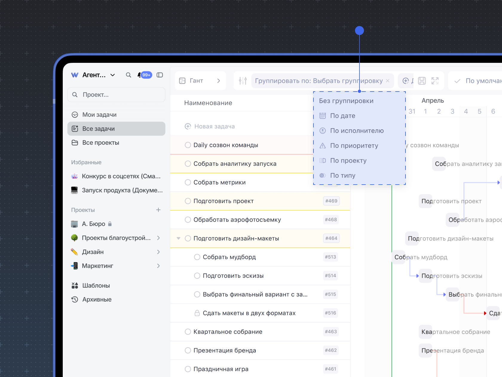 Фильтры также позволяют группировать задачи по проектам, приоритету или, например, исполнителям, смотреть общую нагрузку проекта или распределение задач по исполнителям. Чтобы включить группировку, в списке фильтров выберите Группировать по, а затем критерий группировки.