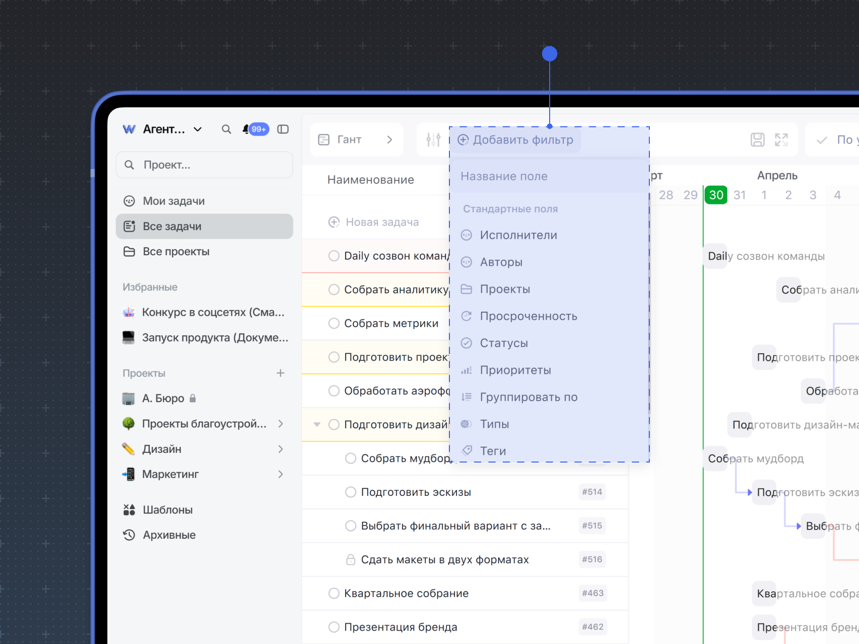 Фильтры позволяют отслеживать задачи-этапы по приоритетам, статусам, типу, тегам, исполнителям, а также группировать их по проектам.