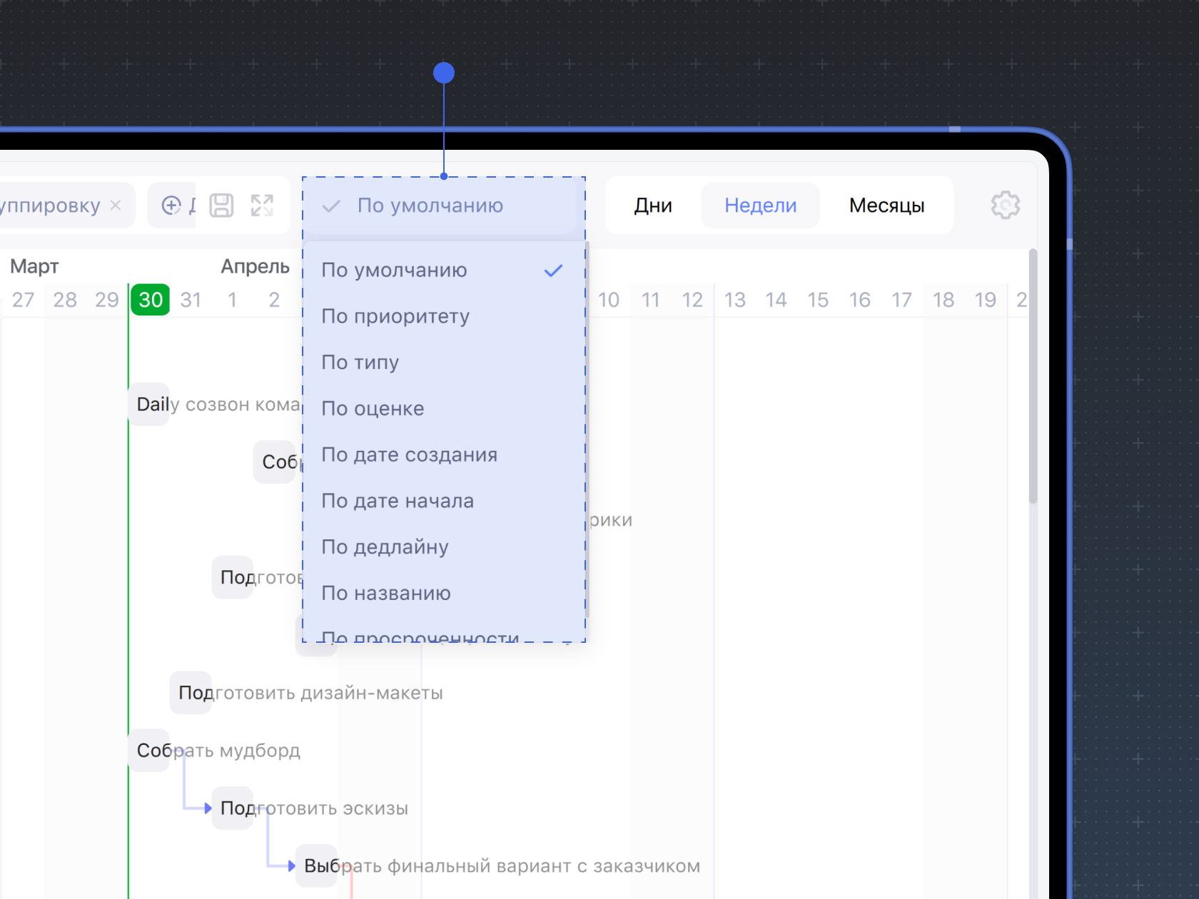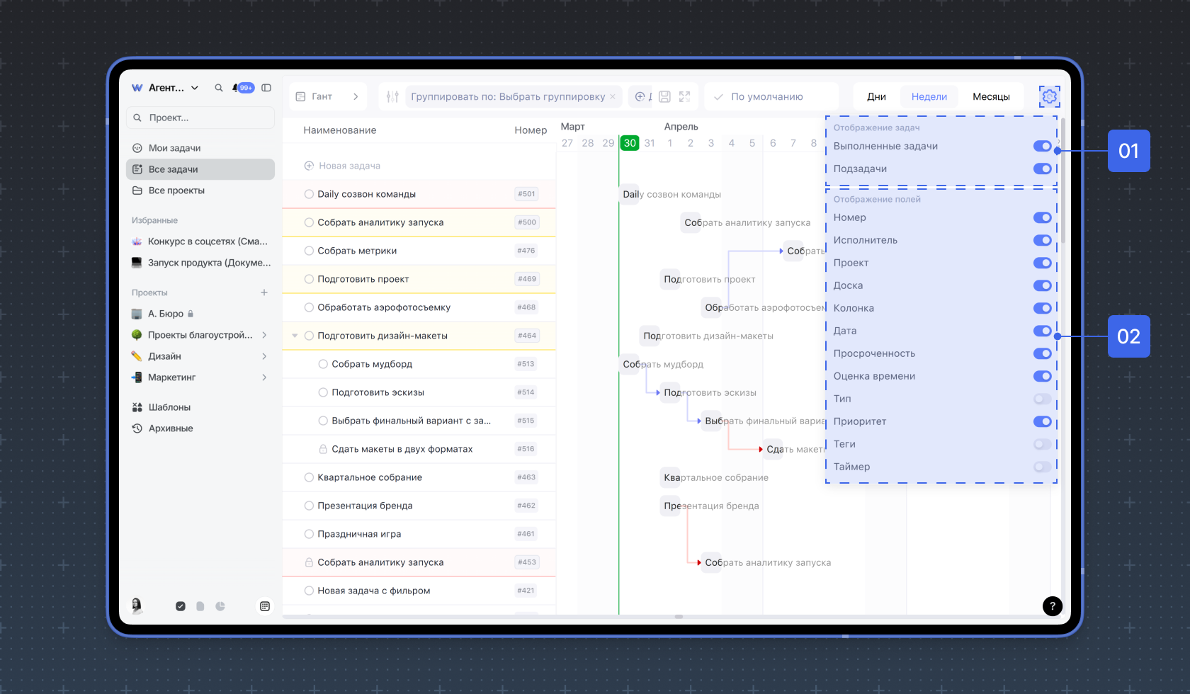 Как и в других режимах просмотра, в режиме Гант отображение можно настраивать под себя. Для этого нажмите на иконку шестерёнки справа на панели инструментов. Выберите нужные настройки.