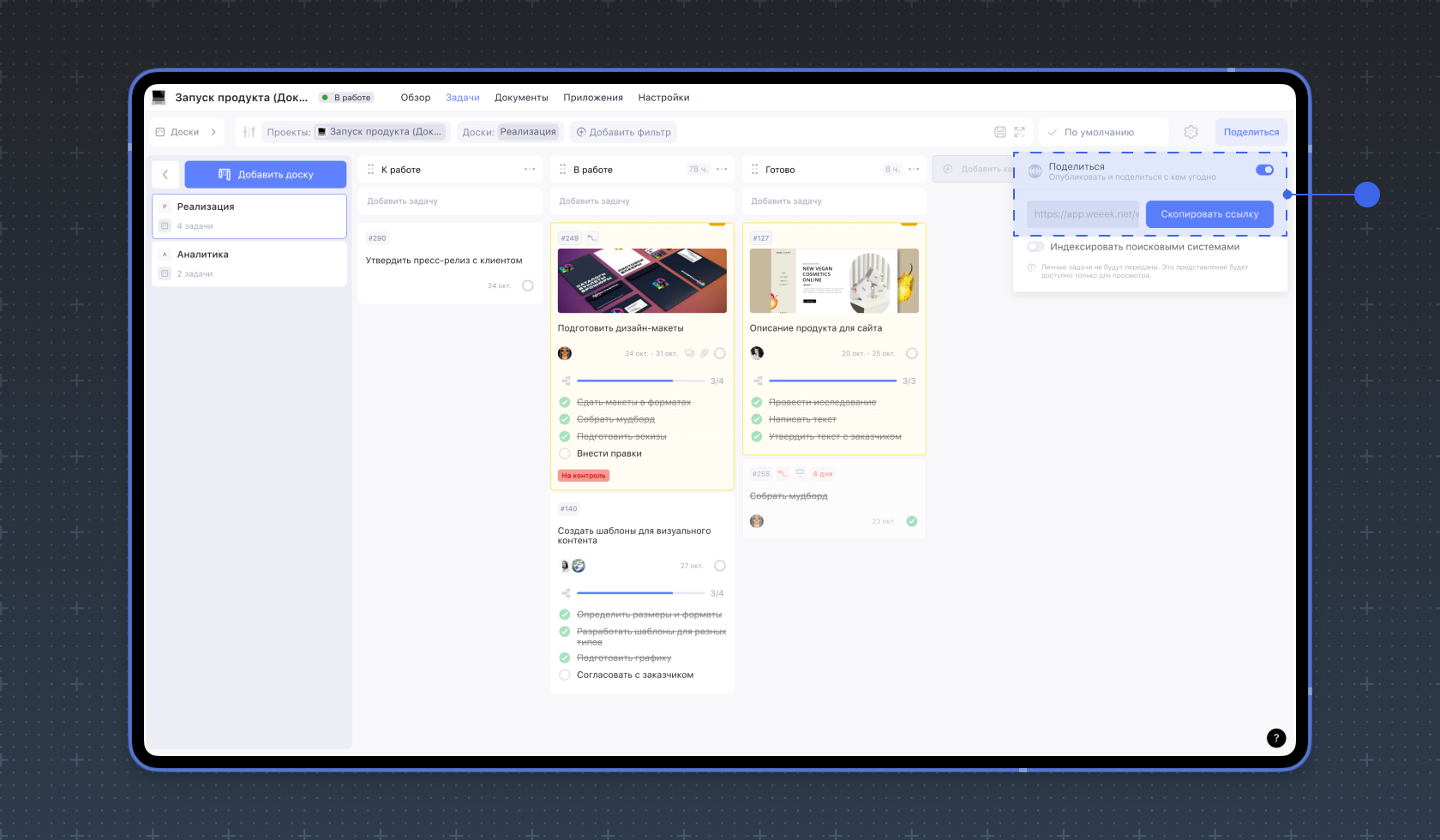 Чтобы разместить страницу для просмотра в интернете, активируйте переключатель Индексировать поисковыми системами. Ссылка выдает доступ к просмотру задач на выбранной доске