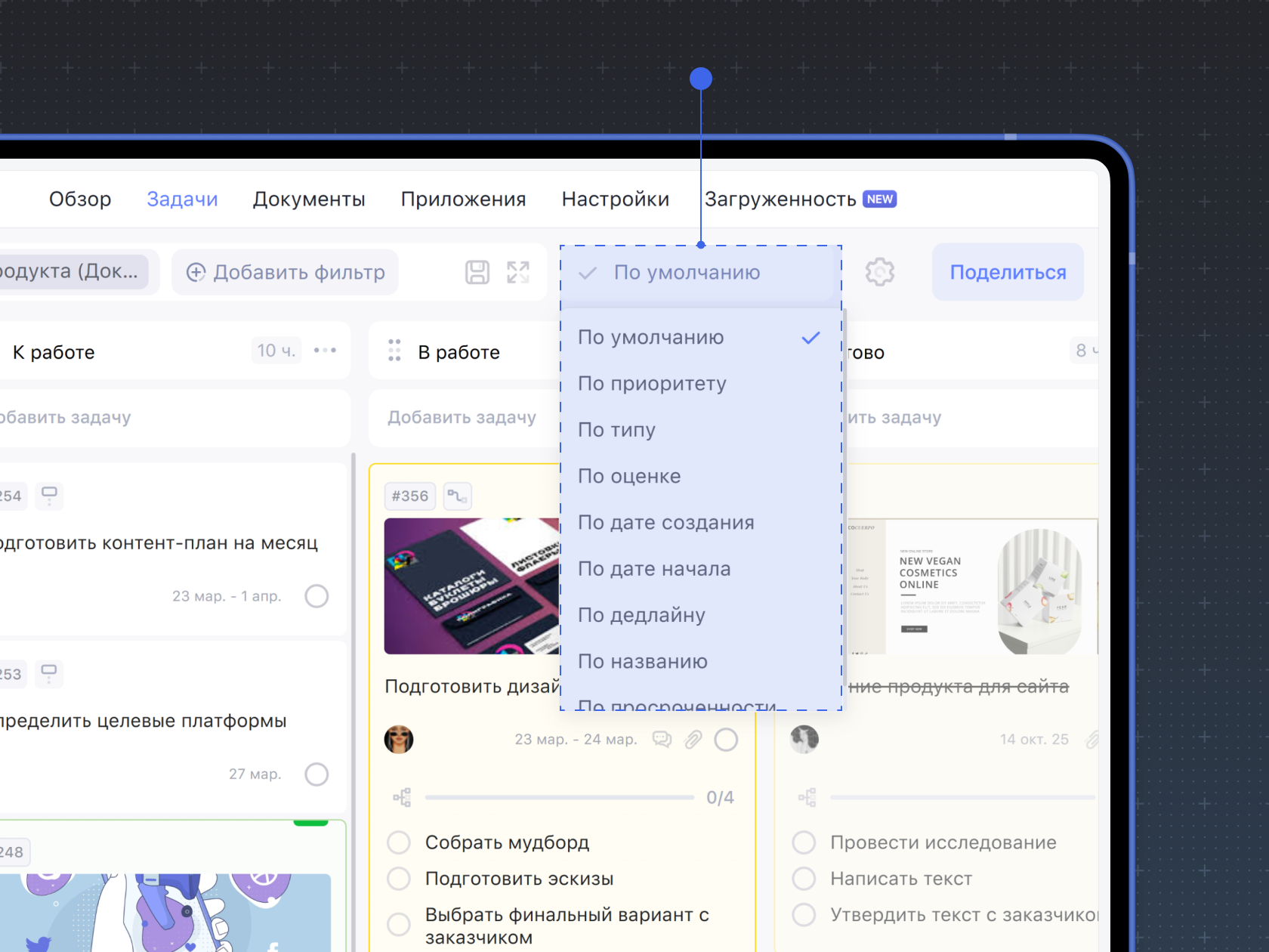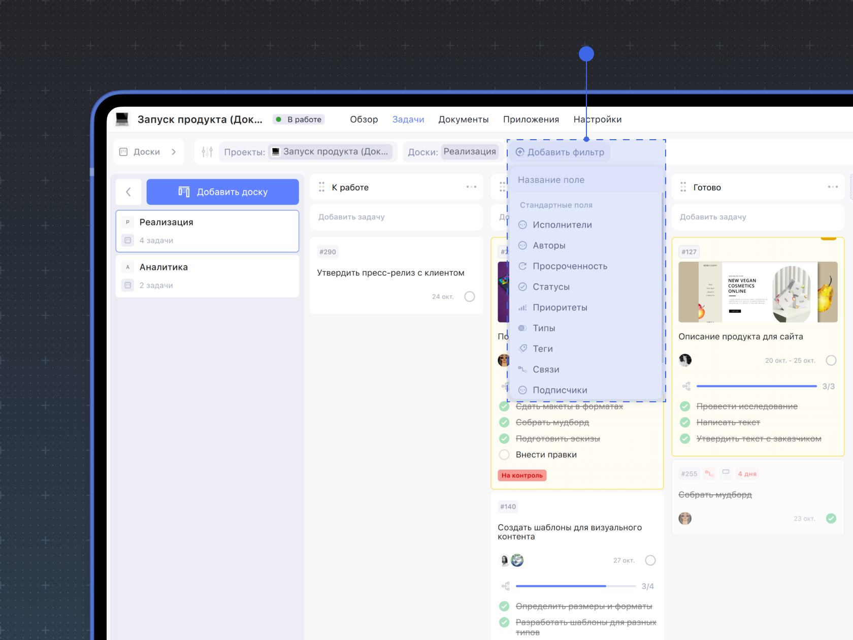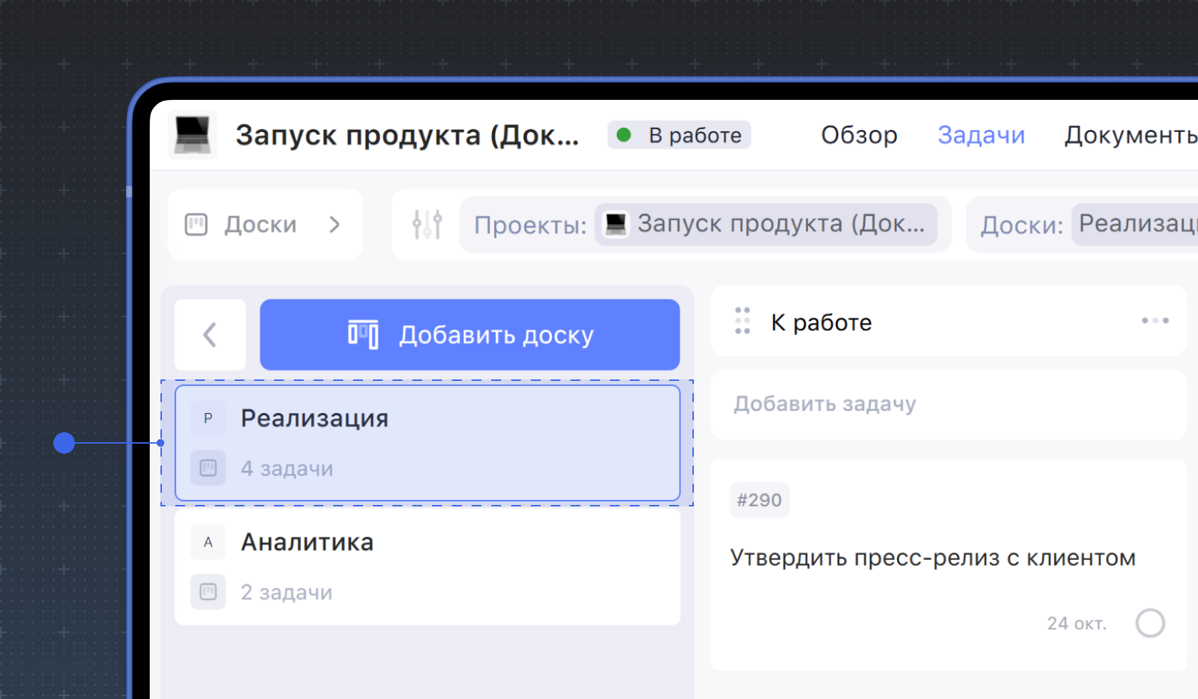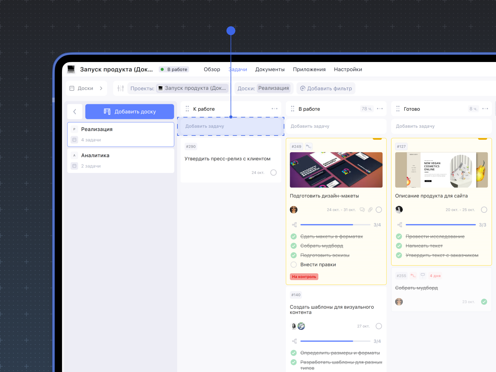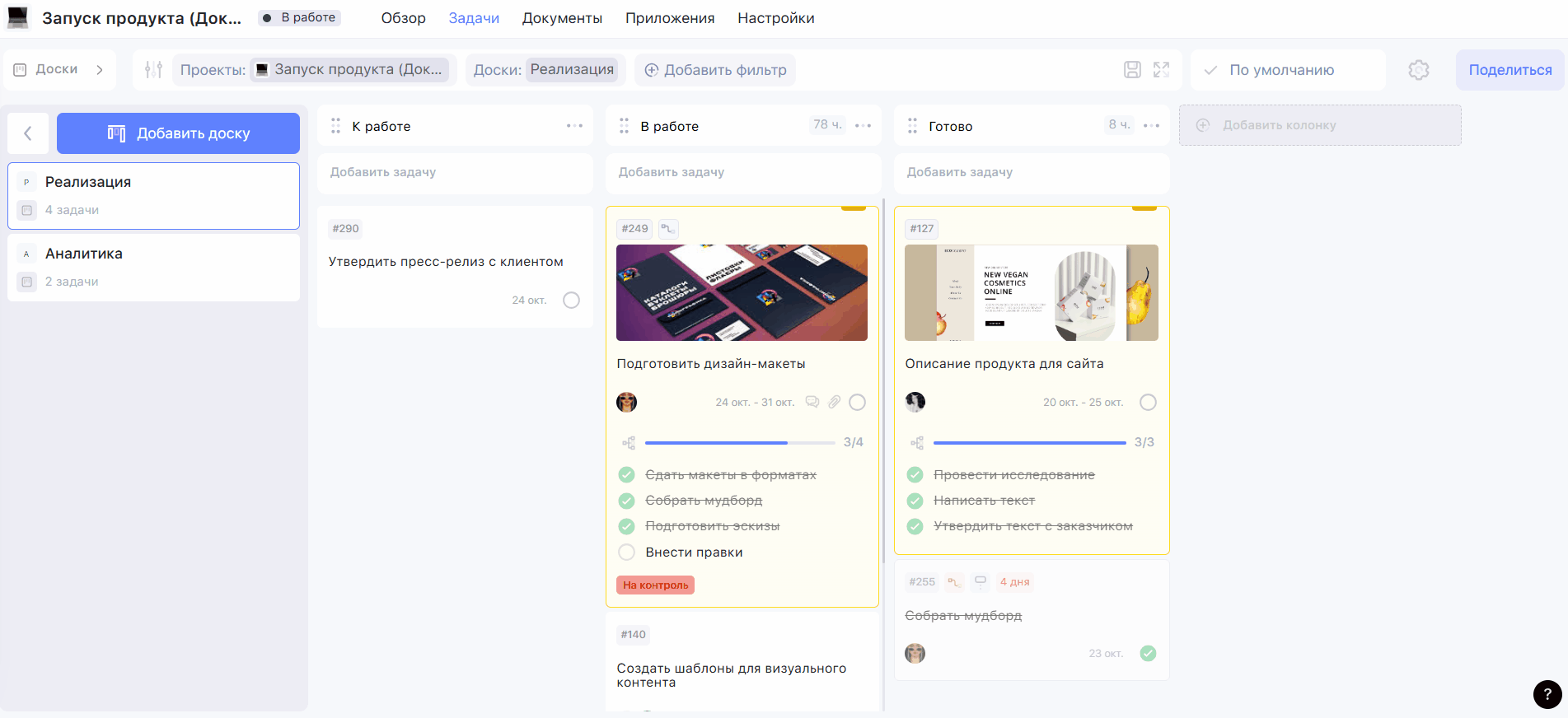 Режим просмотра Доски позволяет группировать задачи проекта по процессам и этапам. На доске задачи располагаются в колонках, каждая из которых соответствует этапу работы или свойству задачи. Перемещая задачи между колонками, вы можете менять их статус или визуально отслеживать их движение по этапам рабочего процесса.