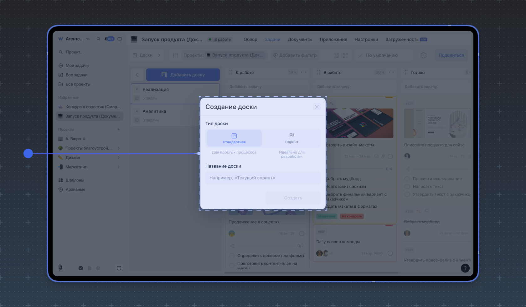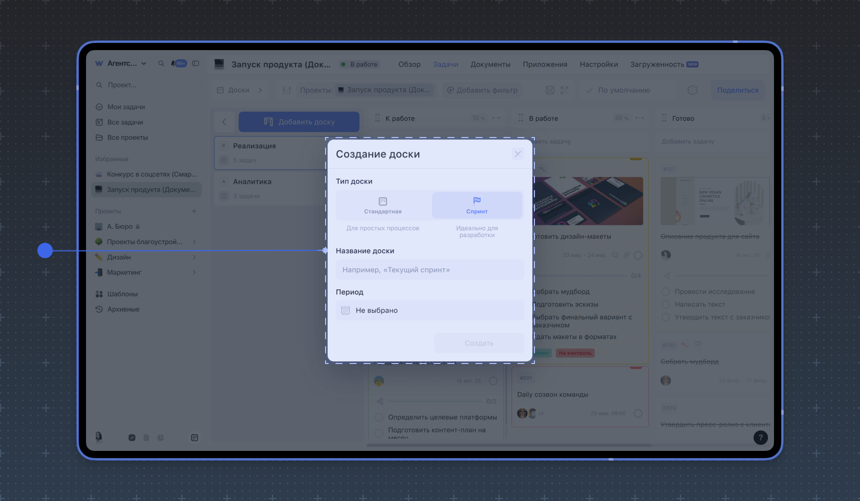 2. Спринт. Идеально подходит для задач разработки при Agile и Scrum-подходах. Для доски Спринт можно дополнительно указать срок спринта