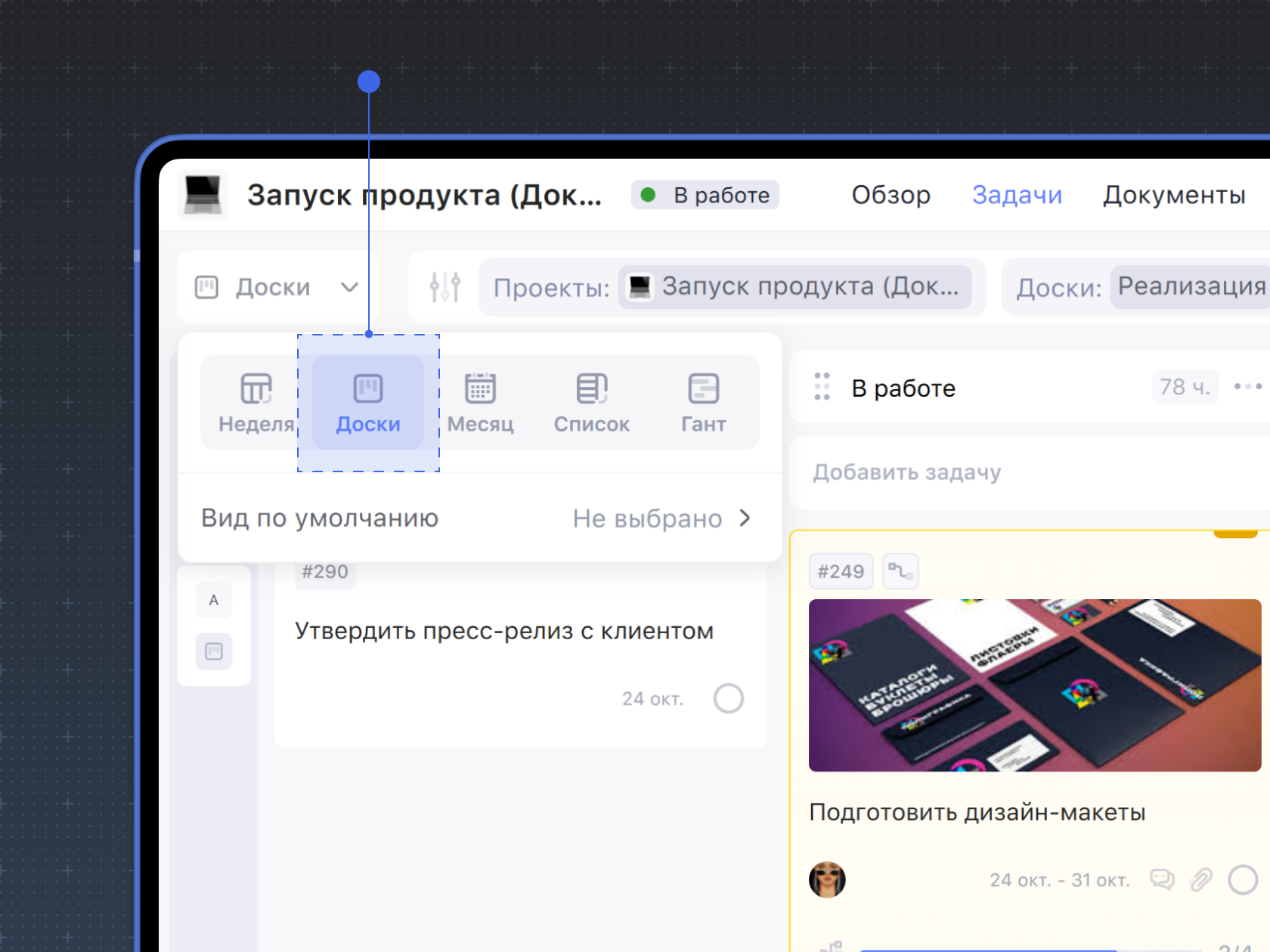 Смотреть задачи в режиме Доски можно только внутри проектов. Чтобы просматривать задачи в разделах Все задачи и Мои задачи, воспользуйтесь другими режимами просмотра.