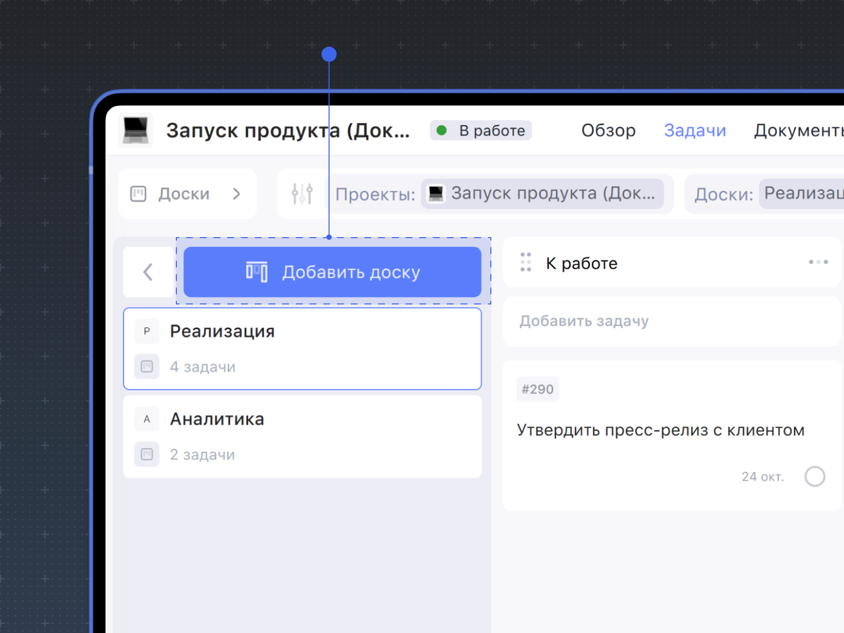 Чтобы создать доску, перейдите в режим просмотра Доски, разверните список досок и нажмите на кнопку Добавить доску.