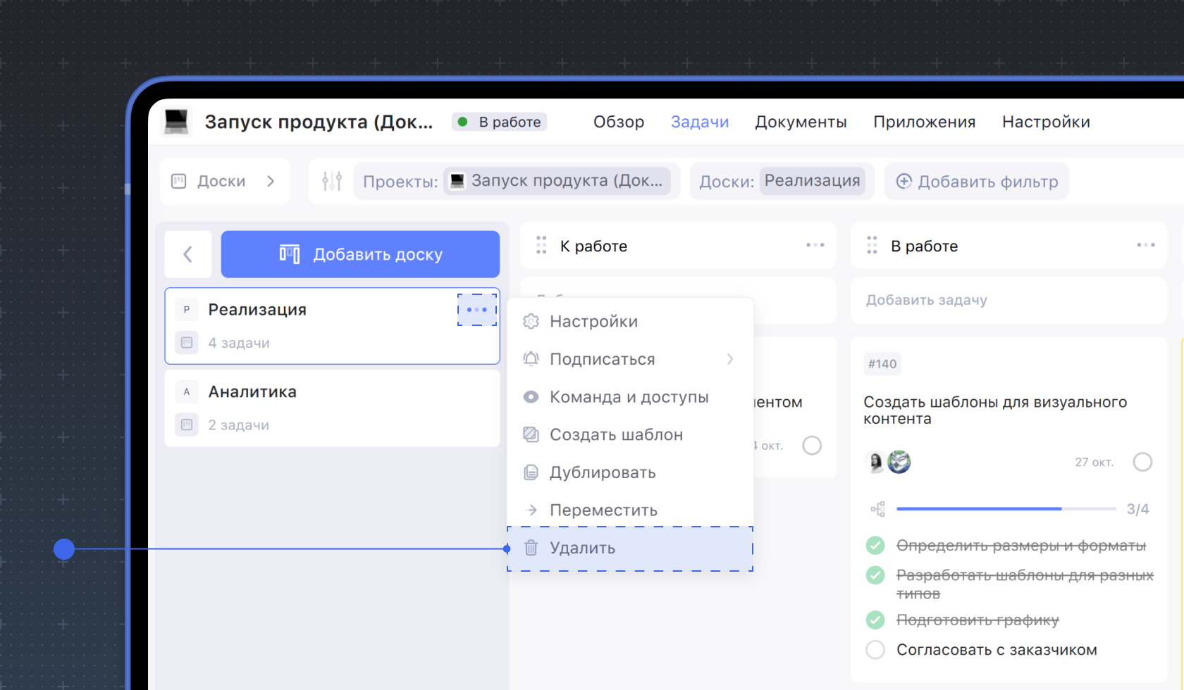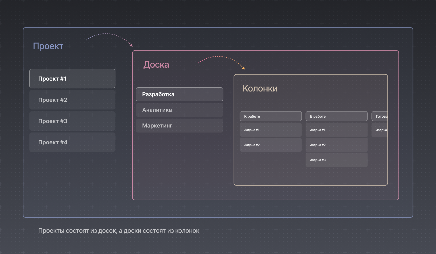 Проекты состоят из досок и позволяют группировать задачи по направлениям и командам. А доски состоят из колонок и группируют задачи внутри одного проекта по этапам рабочего процесса