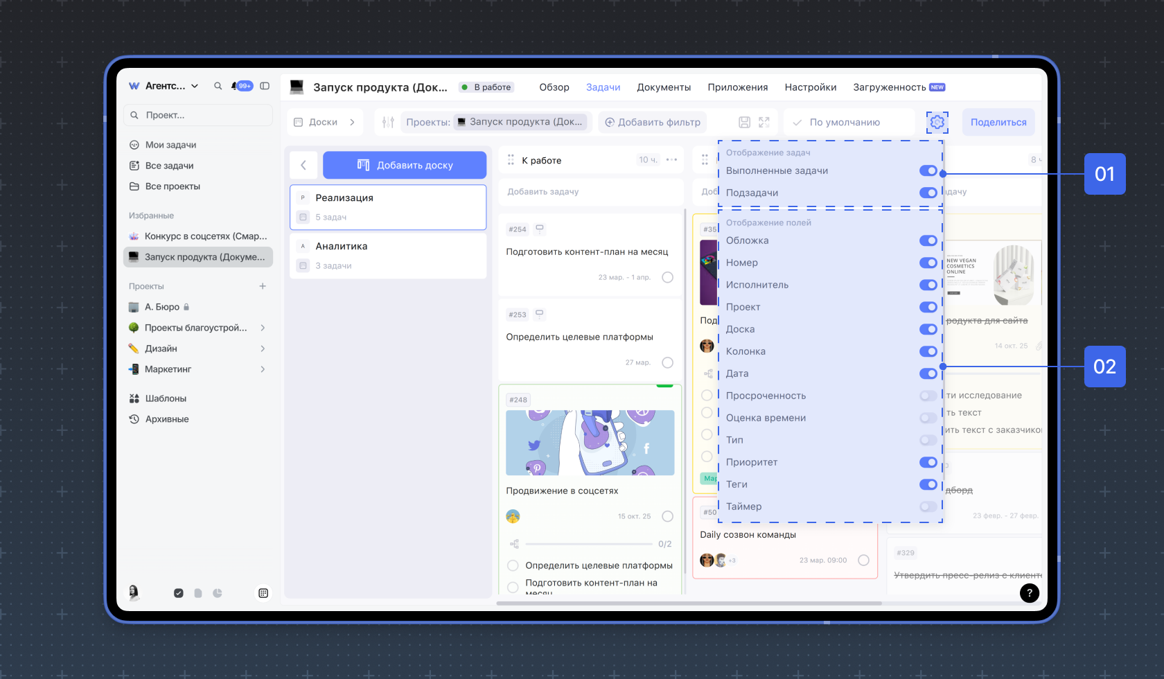 Режим просмотра Доски можно настраивать под себя. Для этого нажмите на иконку шестерёнки справа на панели инструментов. Выберите нужные настройки.