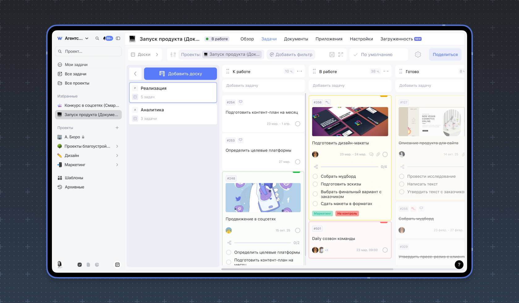 Доски особенно удобны при работе по методу Канбан — можно двигать задачи между колонками подобно стикерам на реальной доске.
