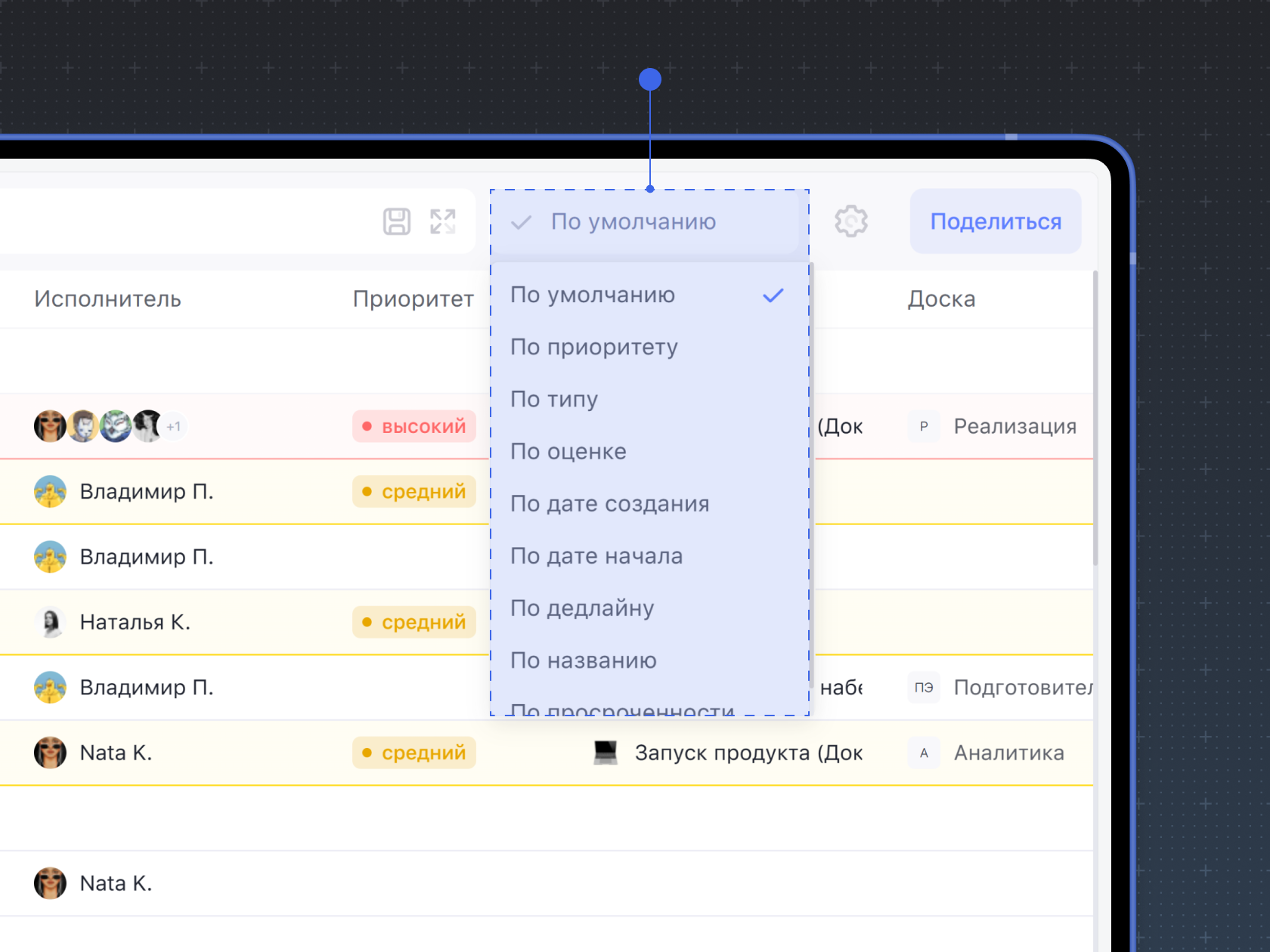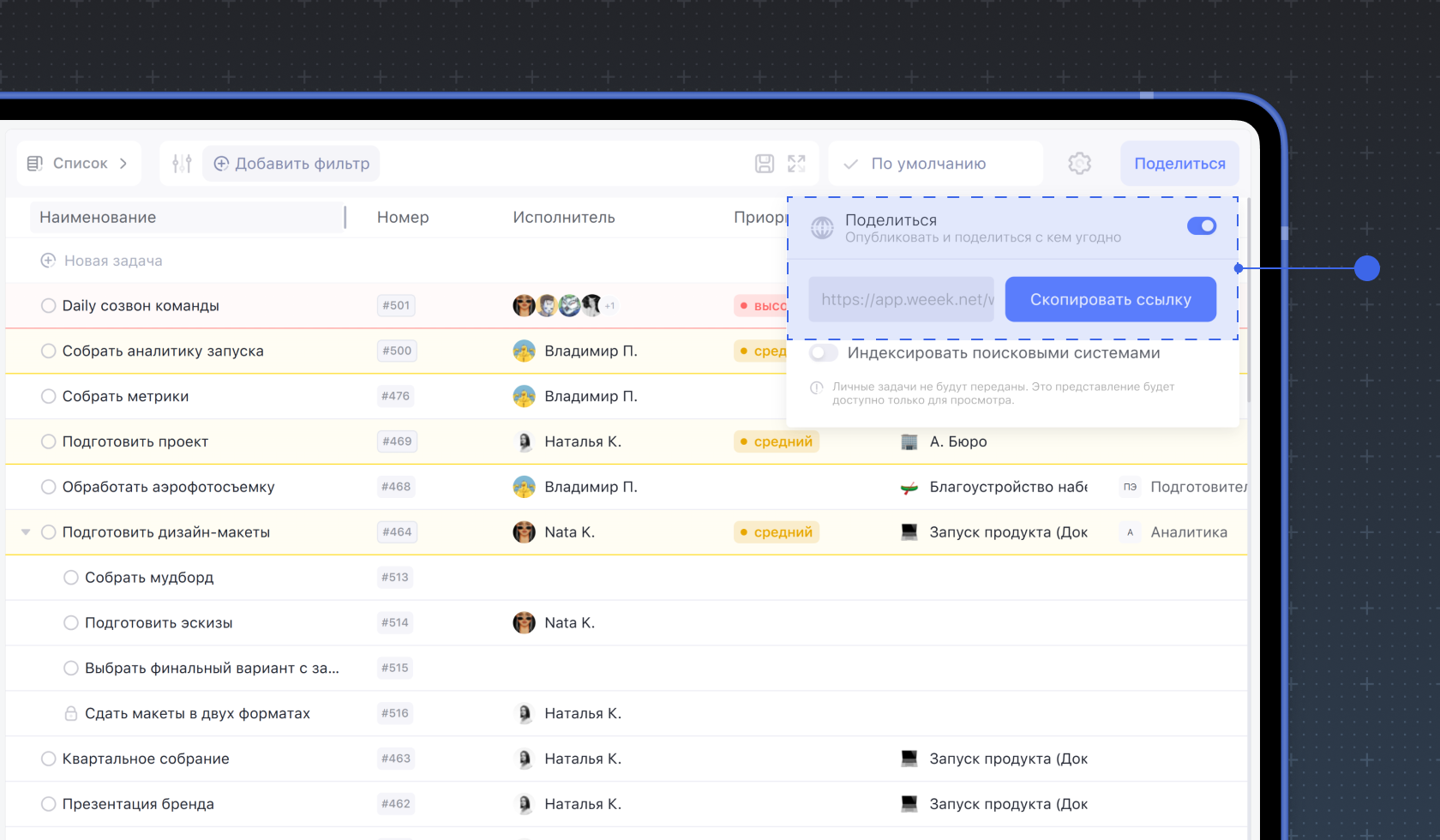 Просмотром задач в формате списка можно делиться. Чтобы выдать доступ другим пользователям или поделиться публично, нажмите на кнопку Поделиться.