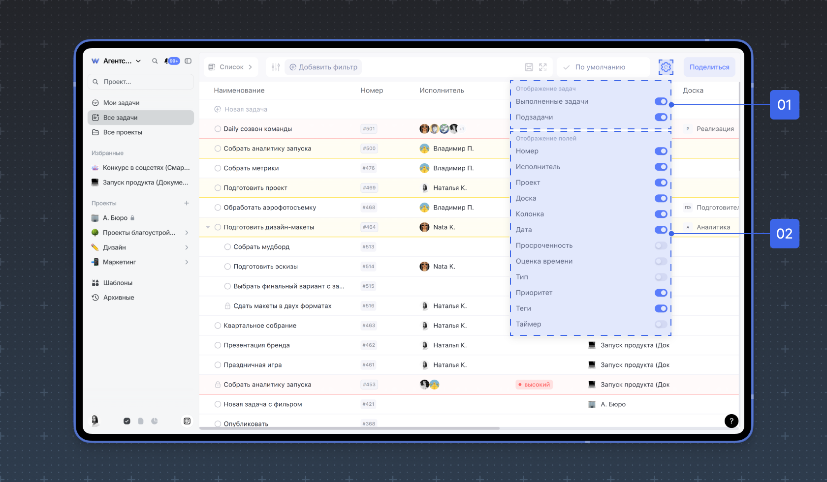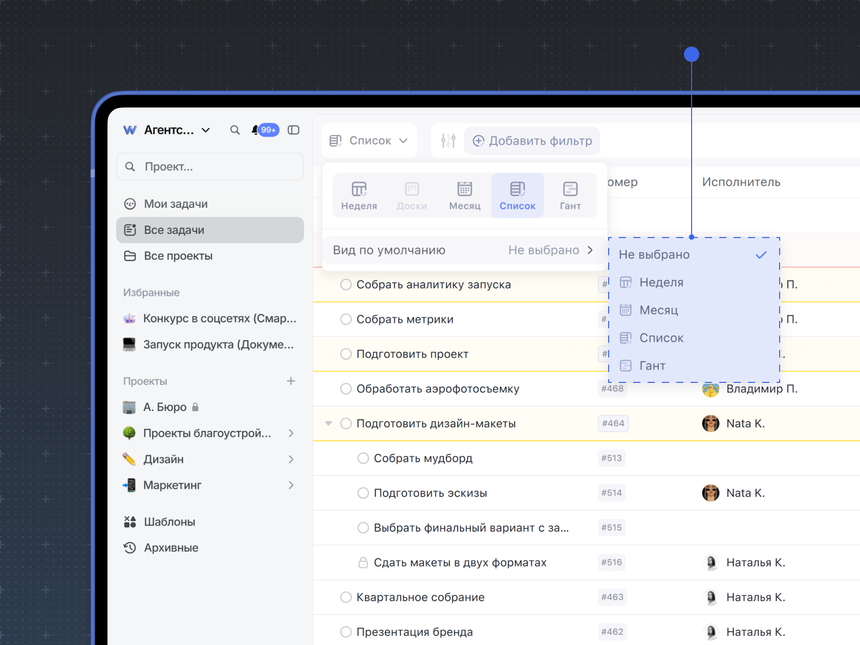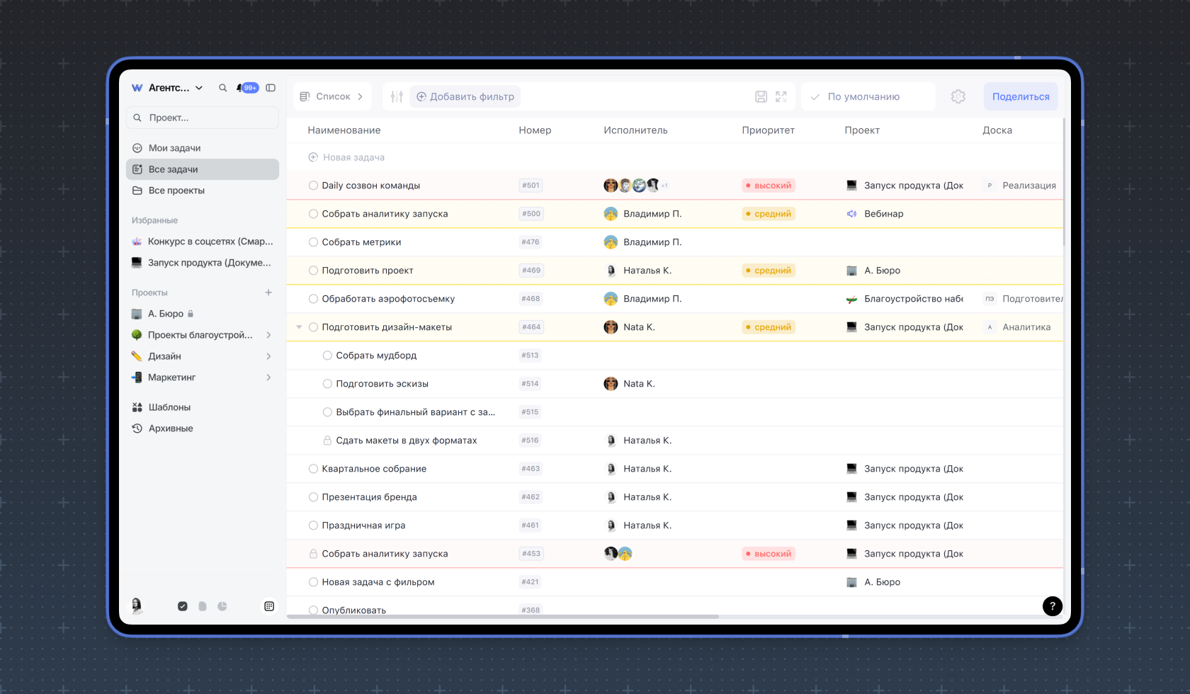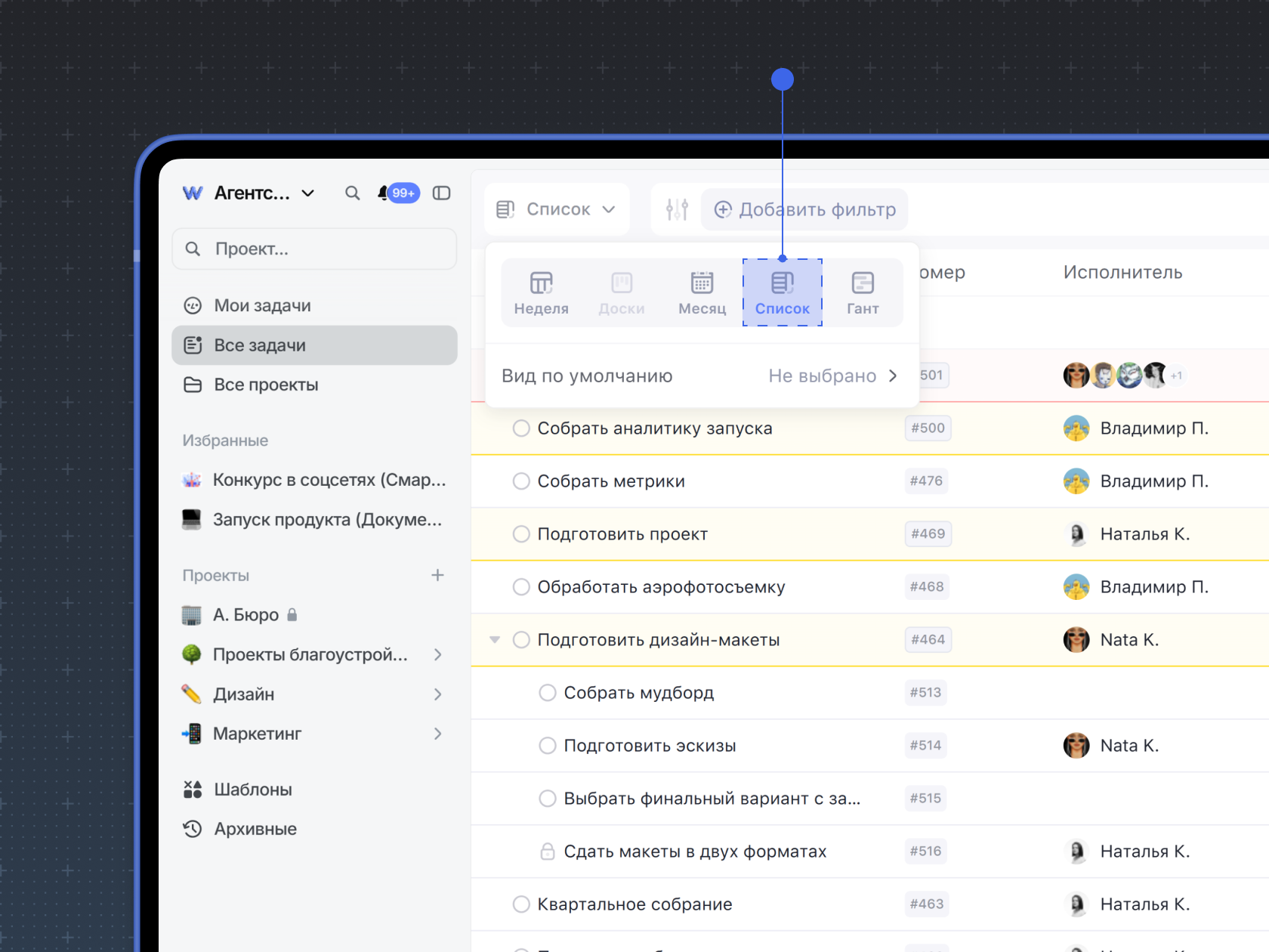 Режим просмотра Список открывает задачи в виде to-do листа со сроками, исполнителями, приоритетом и другими свойствами задачи.