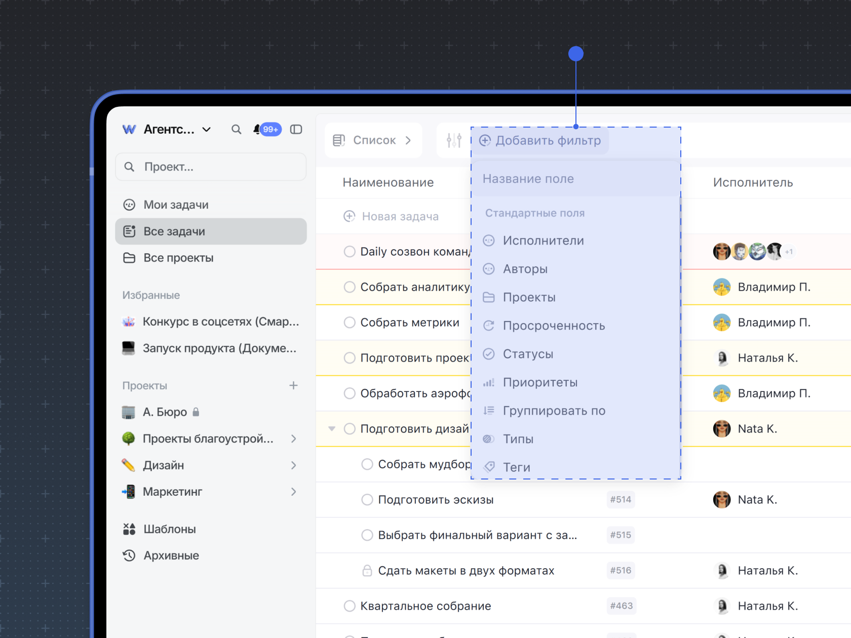 Чтобы включить фильтр задач, на панели инструментов нажмите Добавить фильтр и выберите один из критериев.