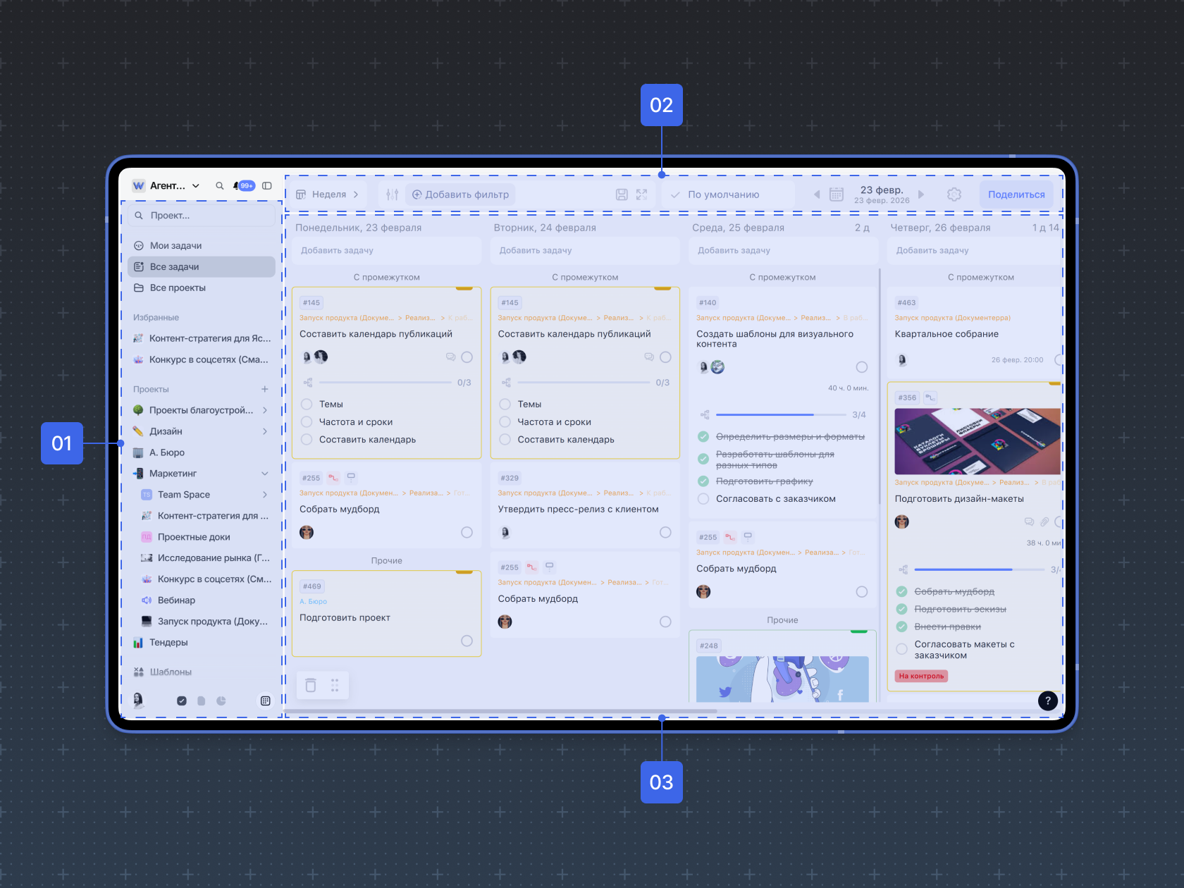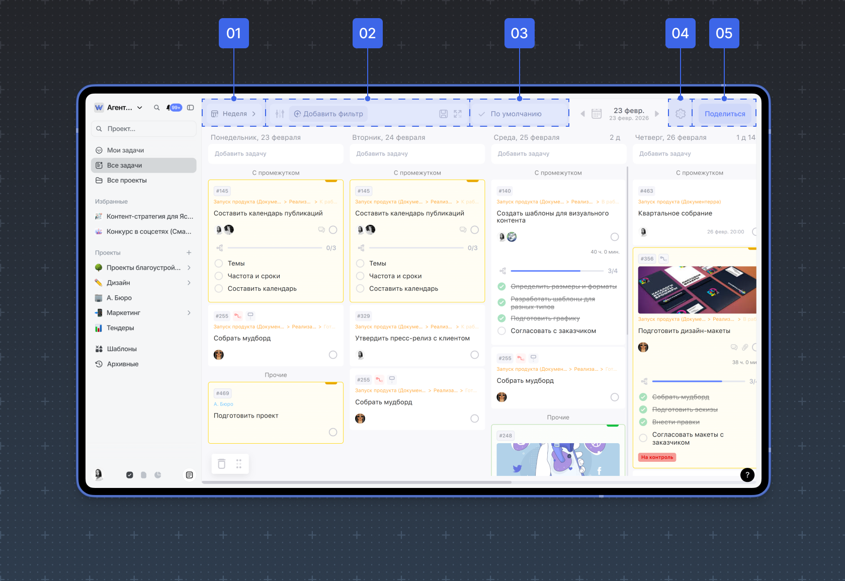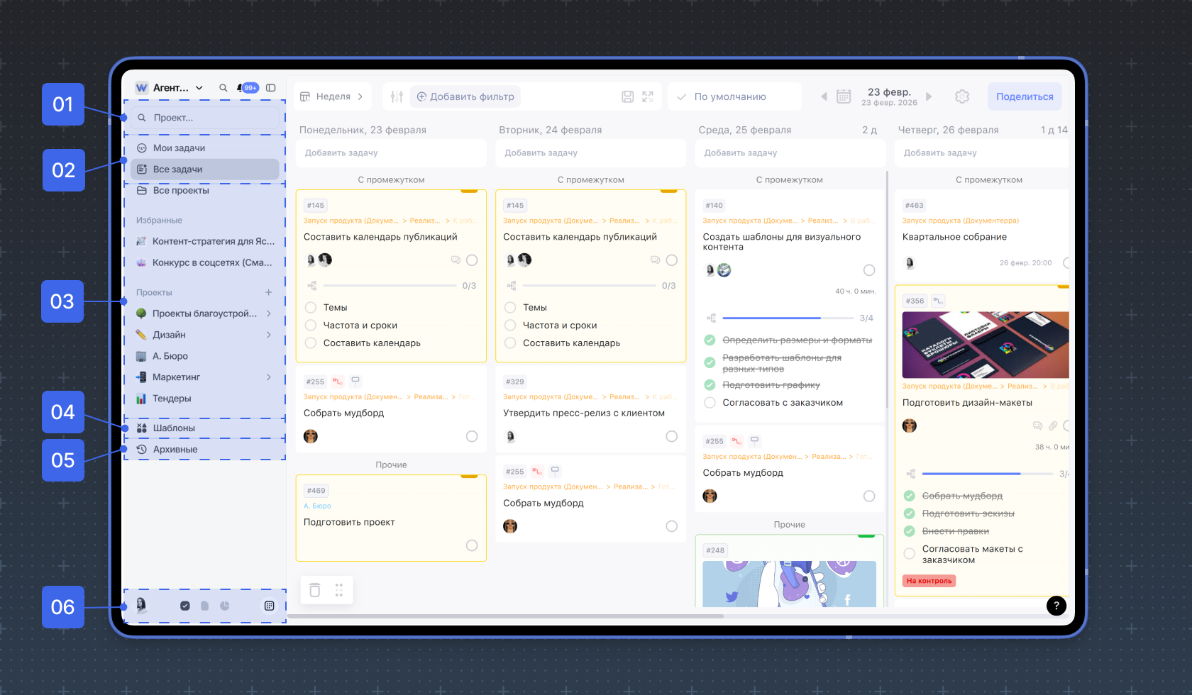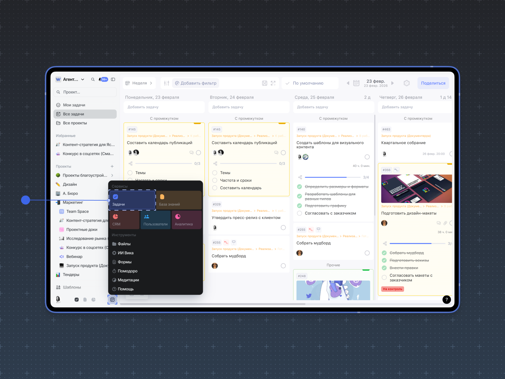 Интерфейс сервиса Задачи состоит из статичной части интерфейса WEEEK, а также: