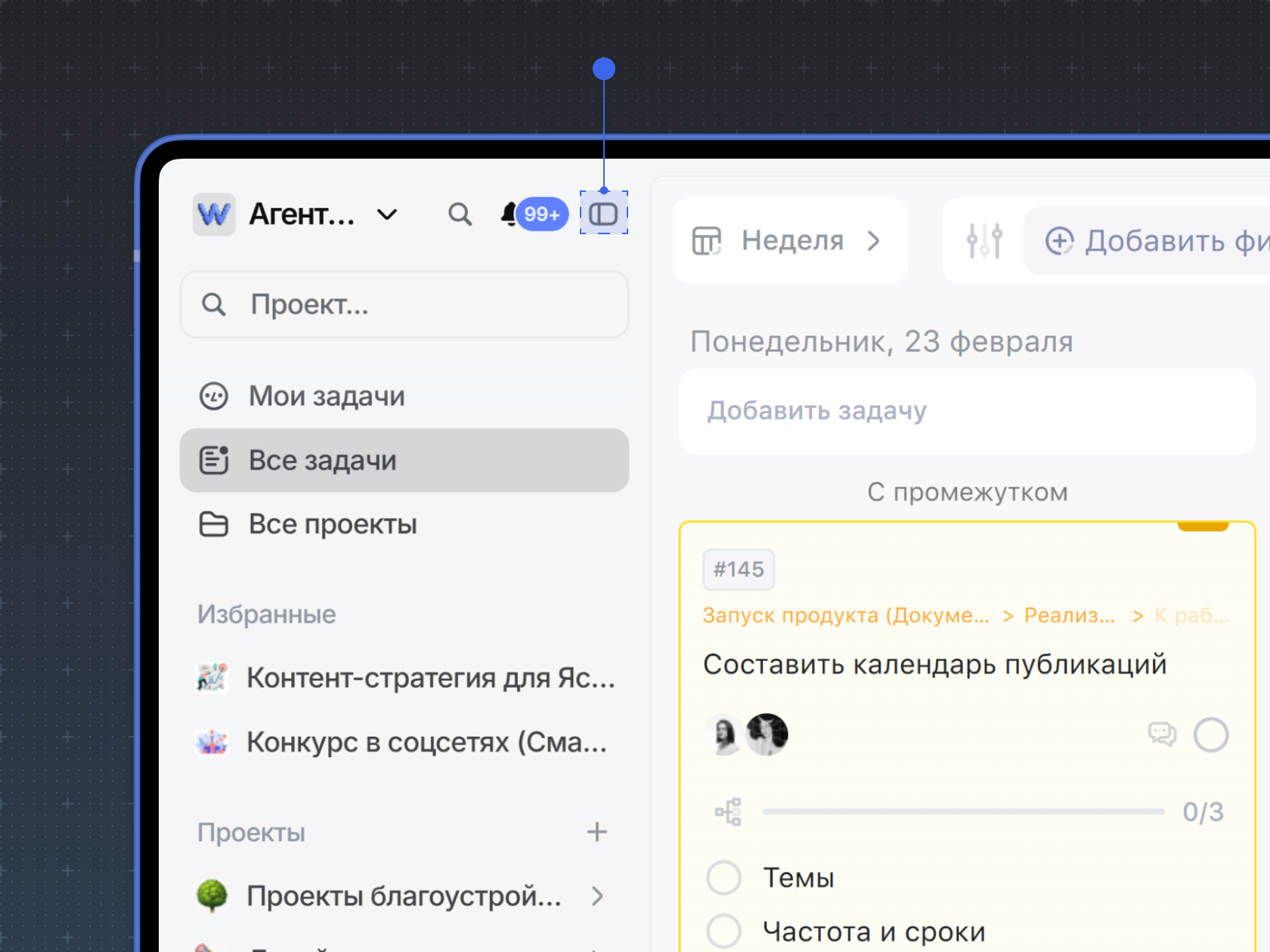 Сервис Задачи в WEEEK — это таск-менеджер, то есть онлайн-инструмент, который помогает управлять задачами: ставить их, задавать сроки выполнения и контролировать прогресс. Можно создавать подзадачи или группировать задачи в проекты.