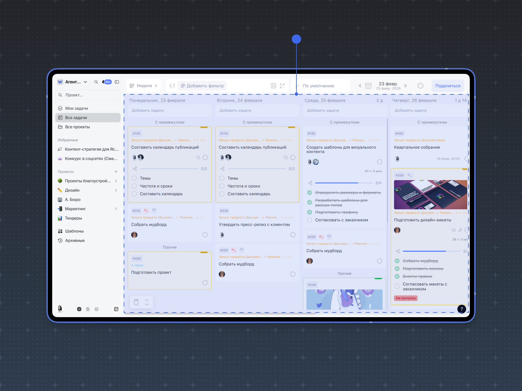 Здесь можно работать с задачами. Рабочая область выглядит по-разному в зависимости от режима просмотра и заданных настроек. WEEEK позволяет отображать задачи несколькими способами: в канбан-досках, списках или календарях на неделю или месяц.