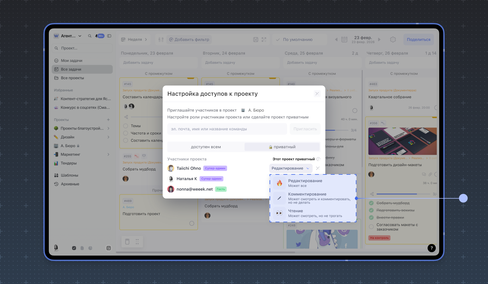 Права доступа – это действия, которые доступны участнику в проекте или доске. В WEEEK три уровня прав доступа: редактирование, комментирование, чтение.