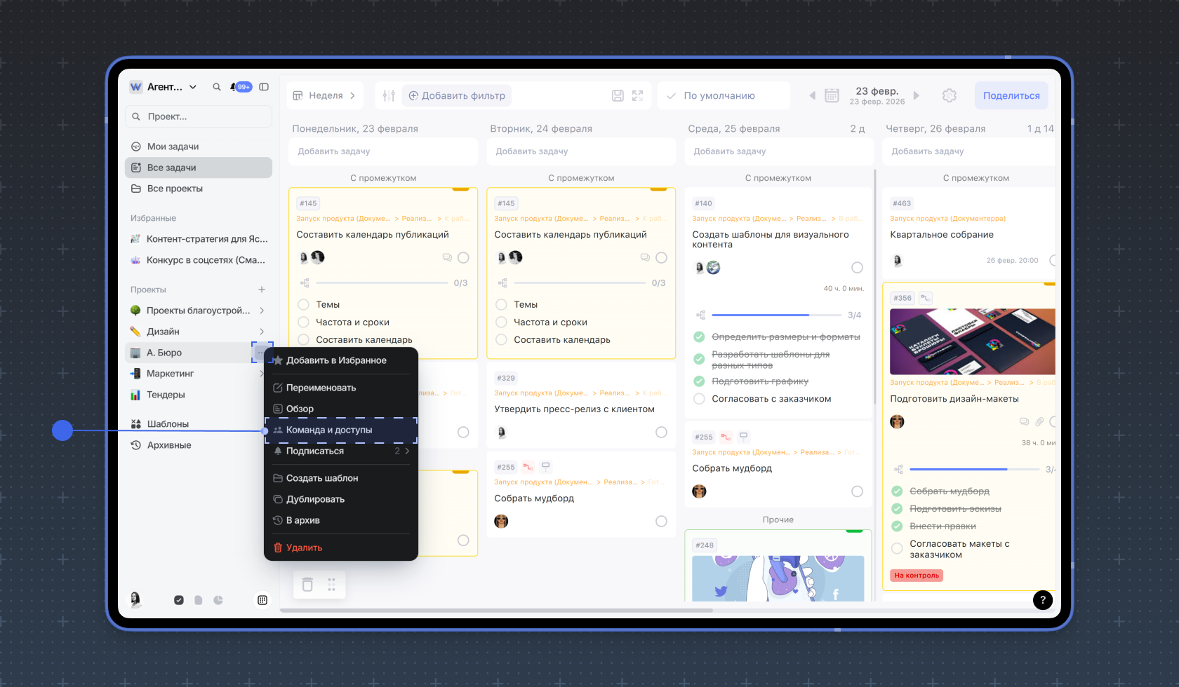 По умолчанию портфели, проекты и доски являются публичными. Чтобы скрыть портфель, проект или доску от пользователей рабочего пространства, сделайте объект приватным. Для этого нажмите на три точки рядом с его названием и в меню выберите Команда и доступы.
