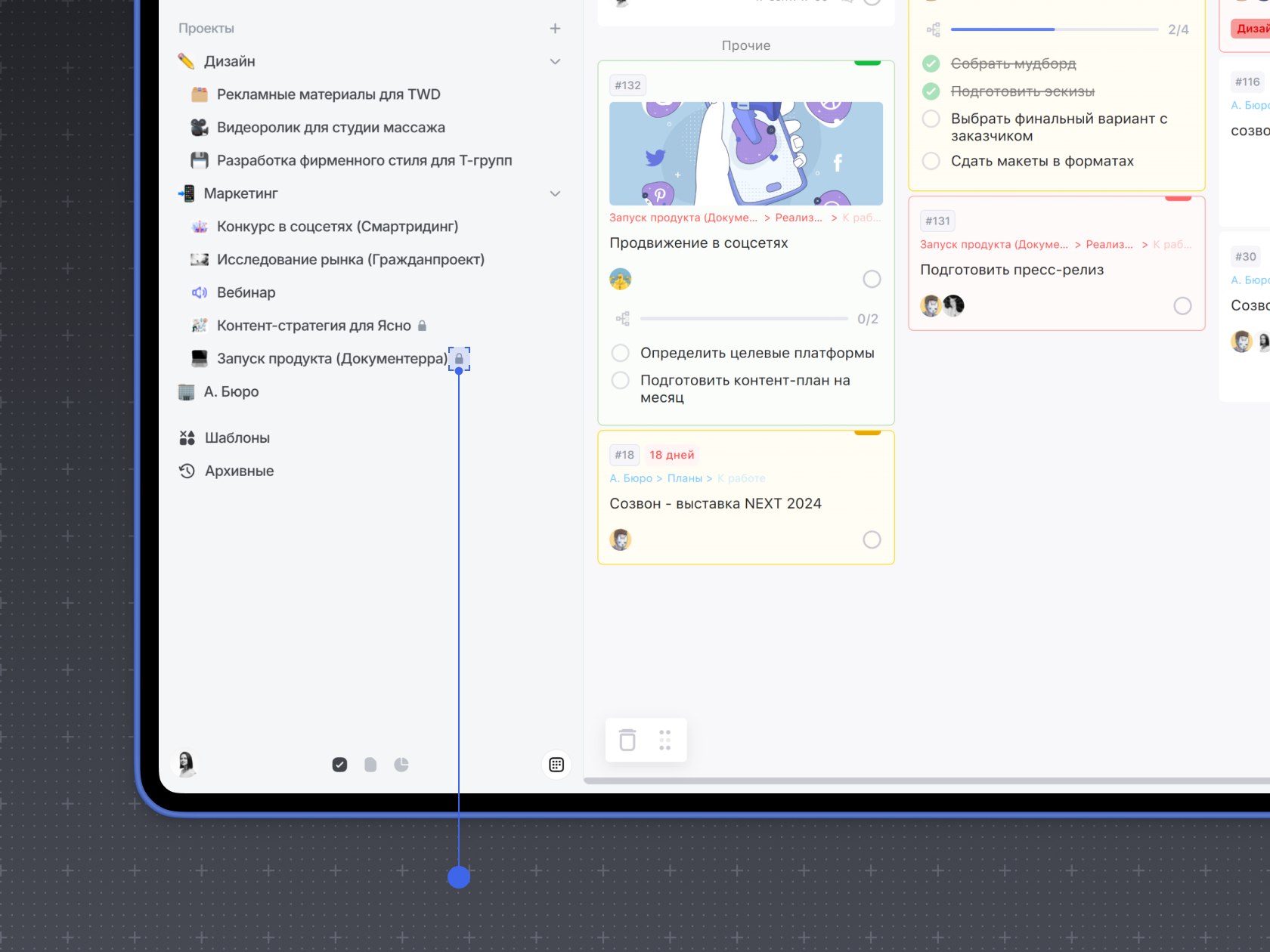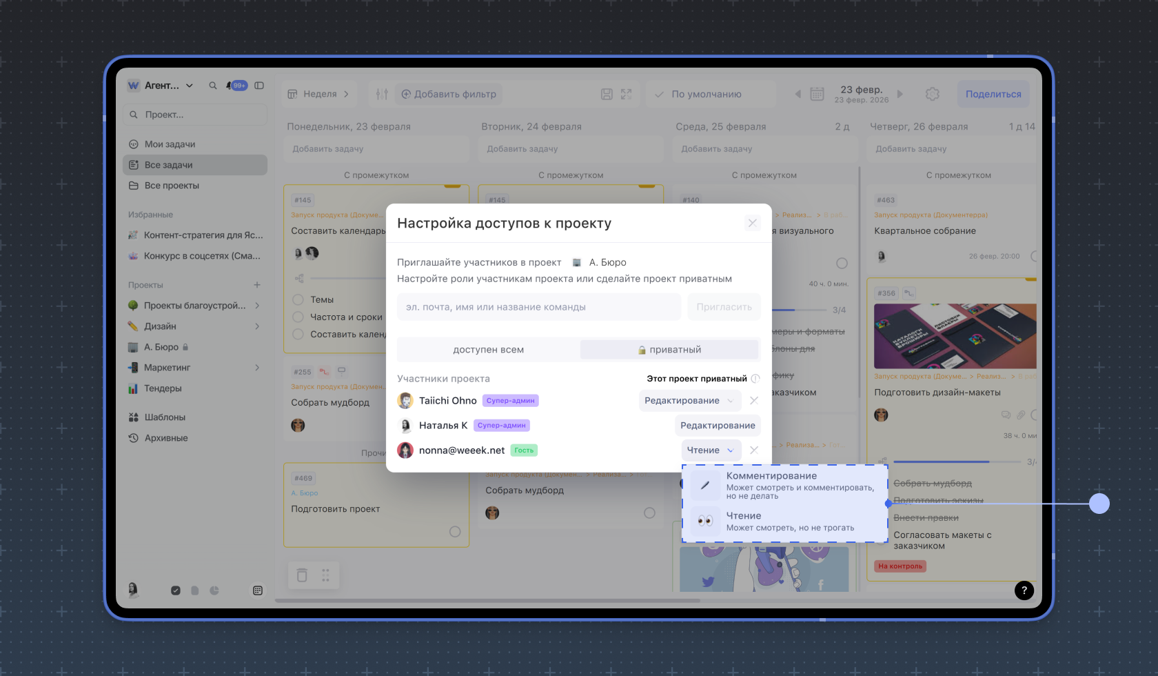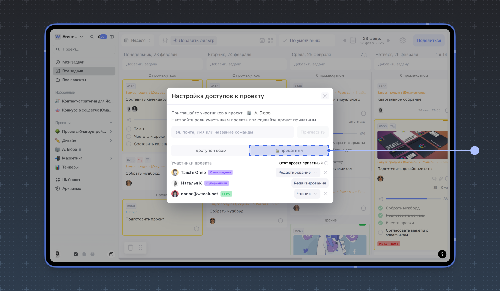 У портфелей, проектов и досок внутри рабочего пространства WEEEK можно настраивать приватность и права доступа: открывать или ограничивать выбранным пользователям просмотр и редактирование информации.