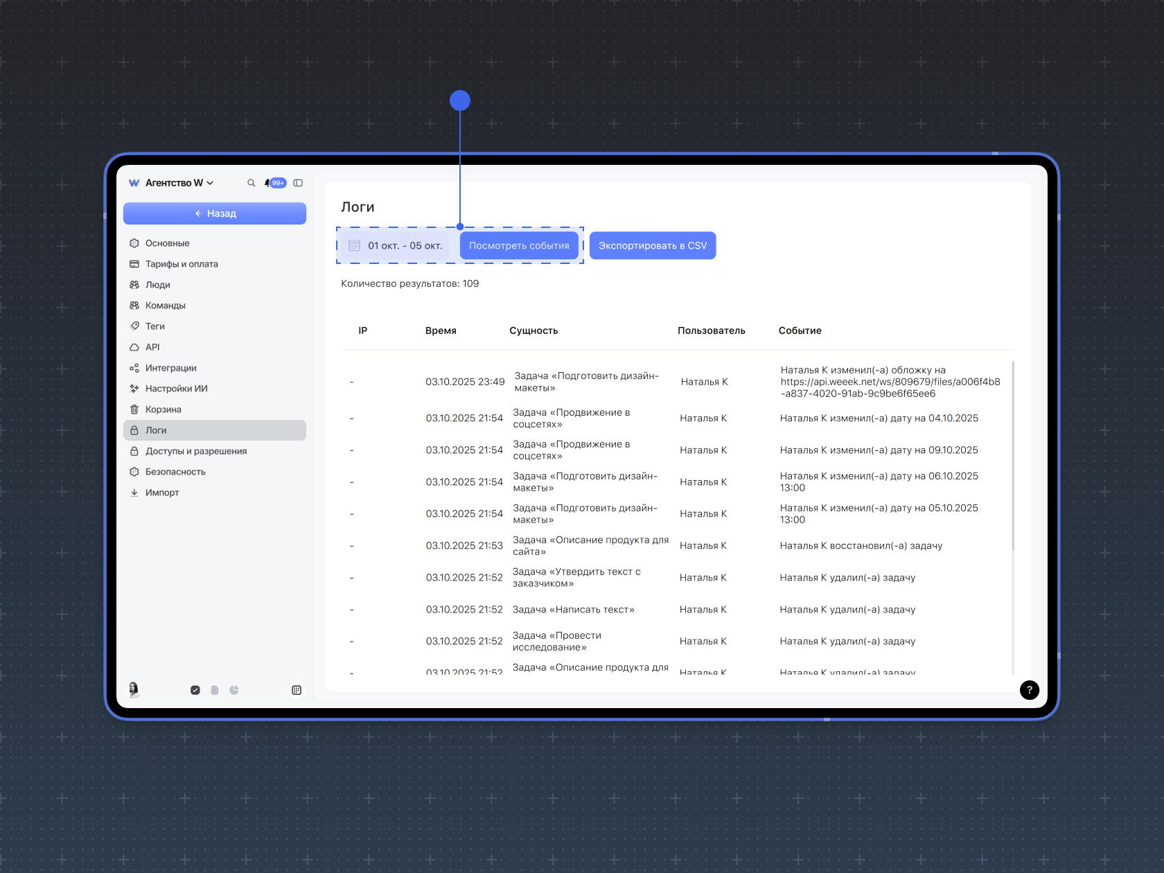 В истории задачи фиксируются только относящиеся к ней изменения. Для просмотра истории действий внутри рабочего пространства, перейдите в его настройки, раздел Логи (доступно на тарифе Бизнес). Выберите период для просмотра и нажмите Посмотреть события