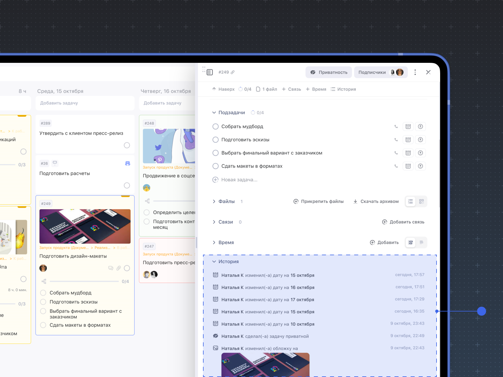 История задачи позволяет отслеживать изменения в задаче и действия, совершенные с ней. Например, в истории можно отследить изменение сроков задачи или узнать дату добавления исполнителя.