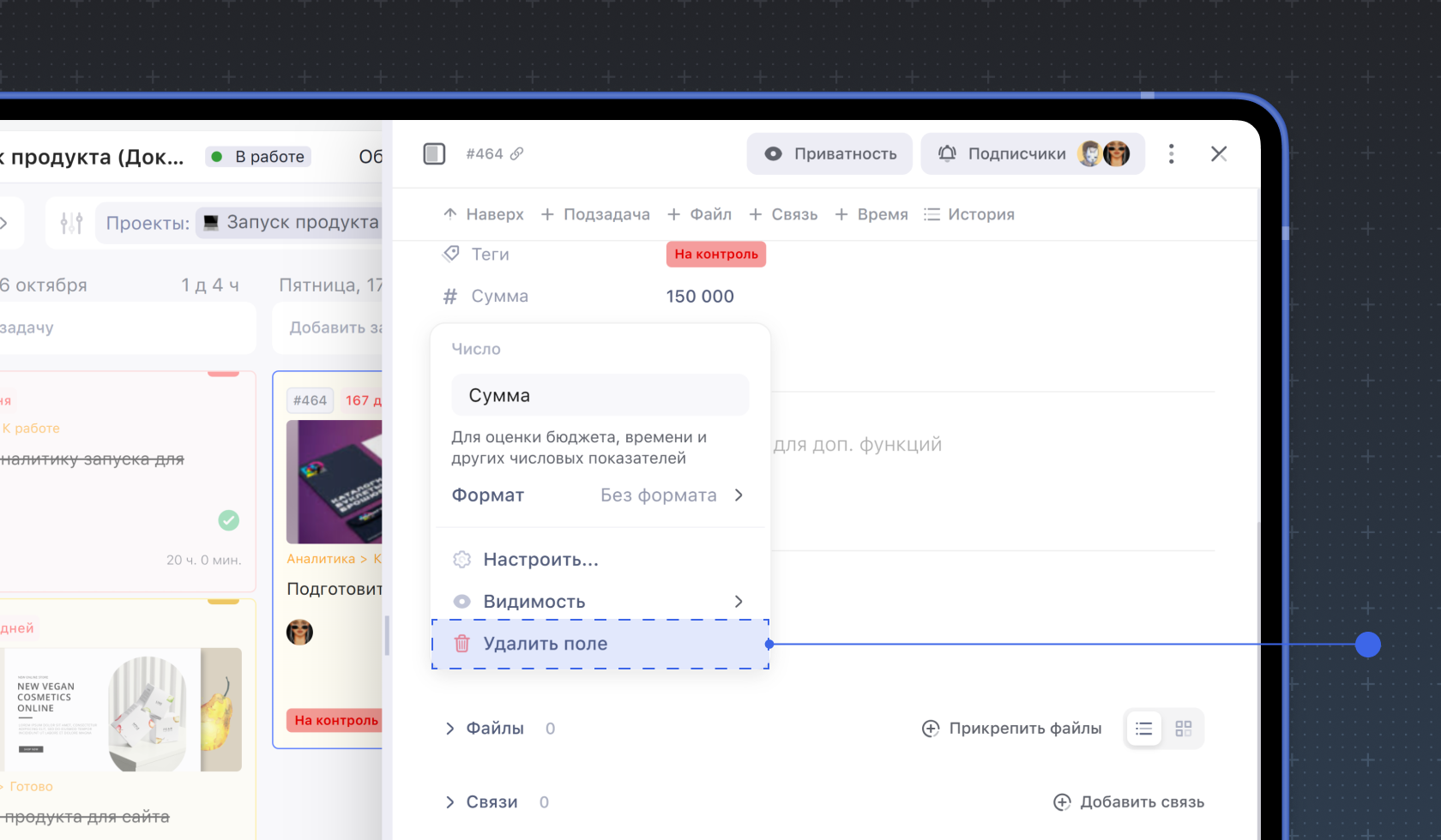Чтобы удалить кастомное поле, нажмите на его название. В мини-окне нажмите Удалить поле.
