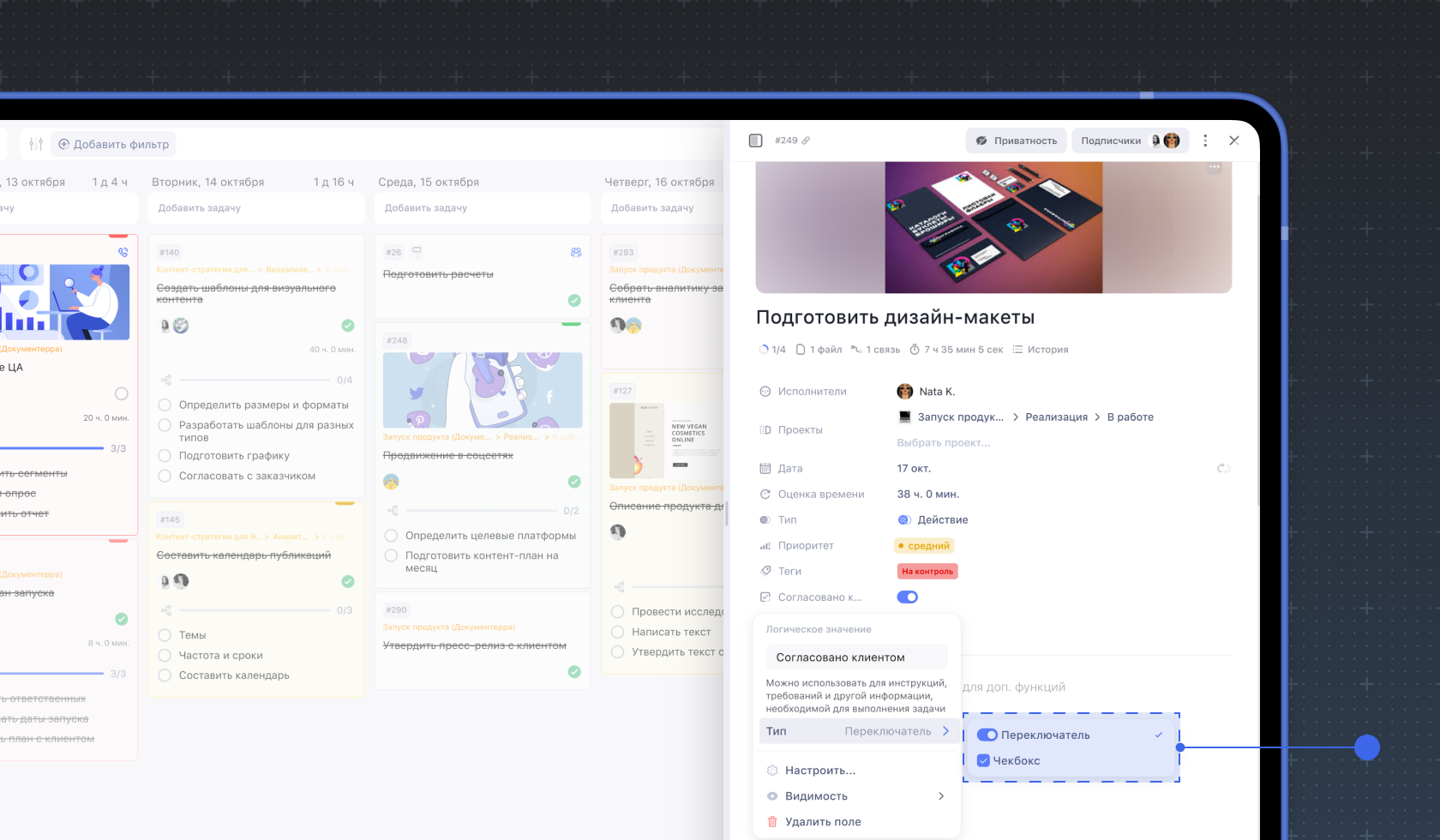 2. Логическое значение. Значение по типу да/нет, визуально выглядит как переключатель. Можно использовать, например, для отображения согласования или сдачи проекта