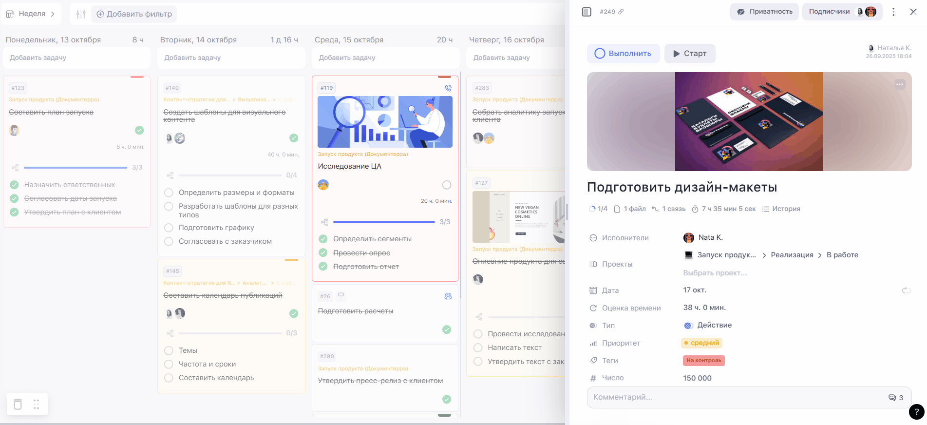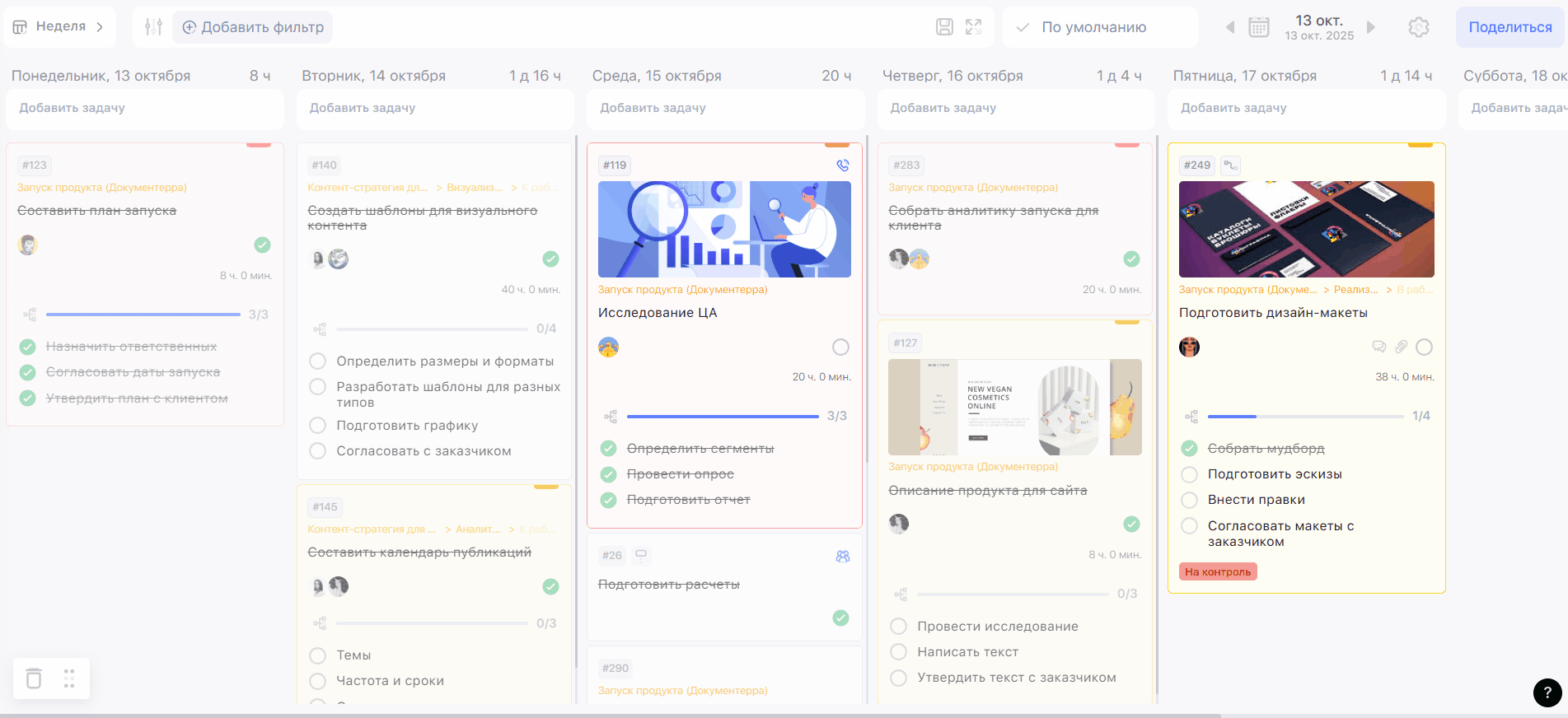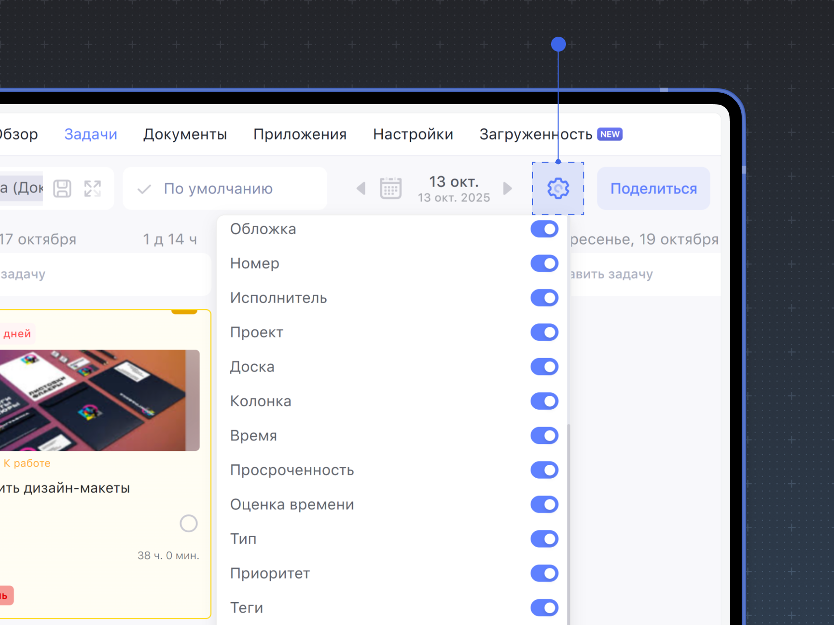 Чтобы настроить отображение кастомного поля на карточке задачи, перейдите в проект, внутри которого поле было создано. В режиме просмотра Неделя или Доски нажмите на шестерёнку в правом углу над задачами.
