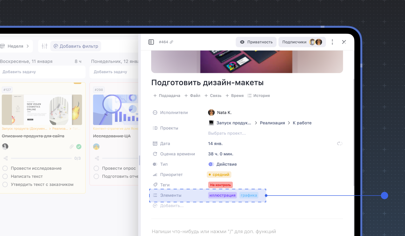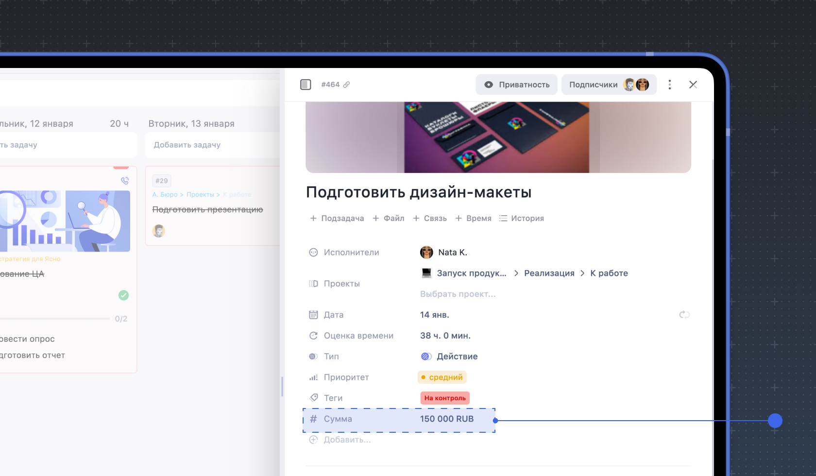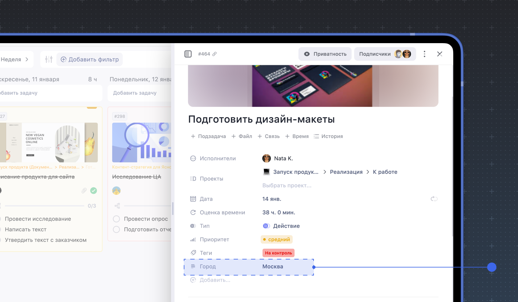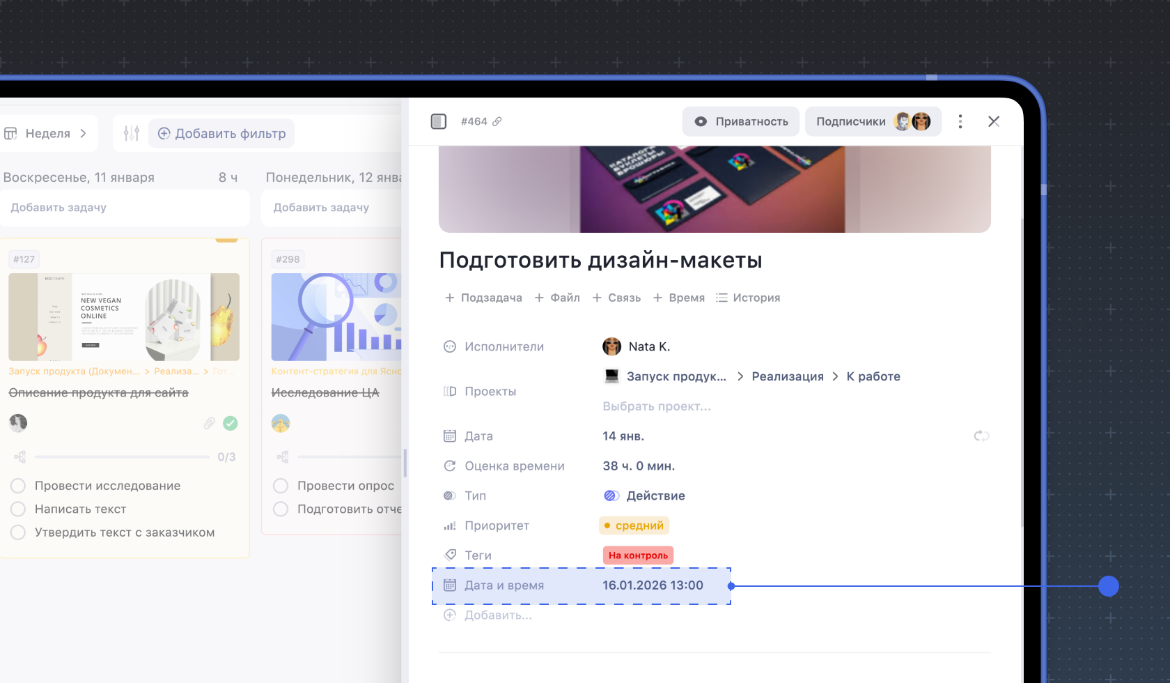 3. Дата и время. Вы можете указать сроки внутри задачи, которые не будут влиять на её дедлайн и отображение внутри календаря