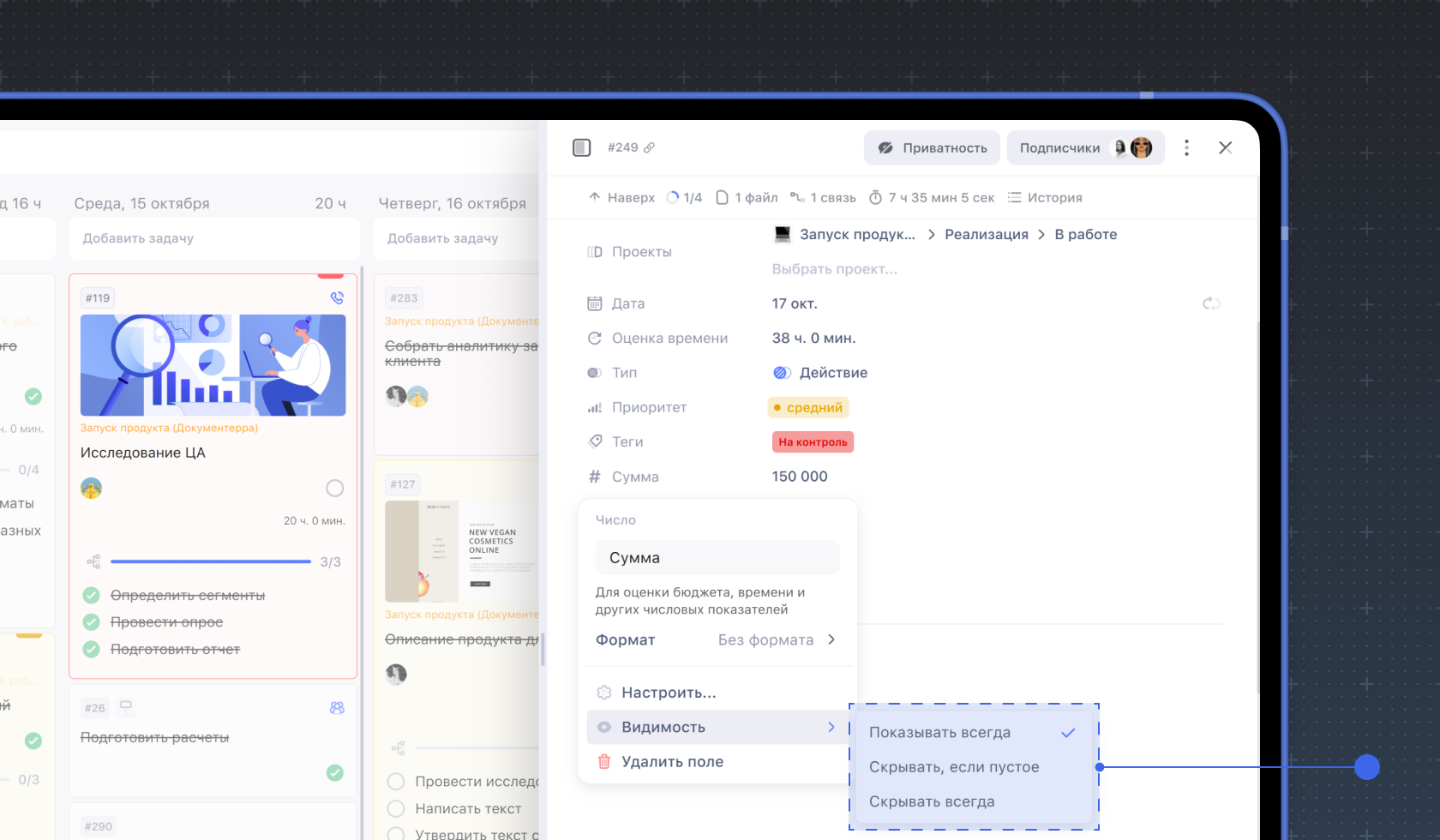 Кастомное поле может работать внутри выбранной доски, проекта или распространятся на задачи во всех проектах.
