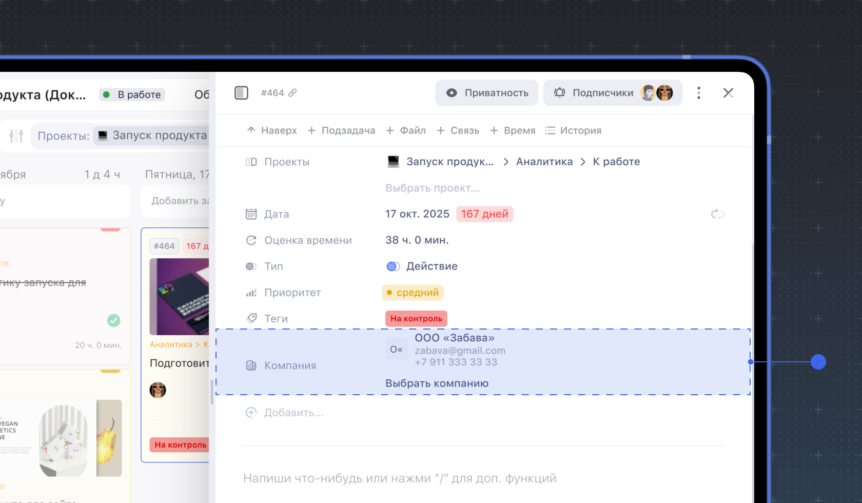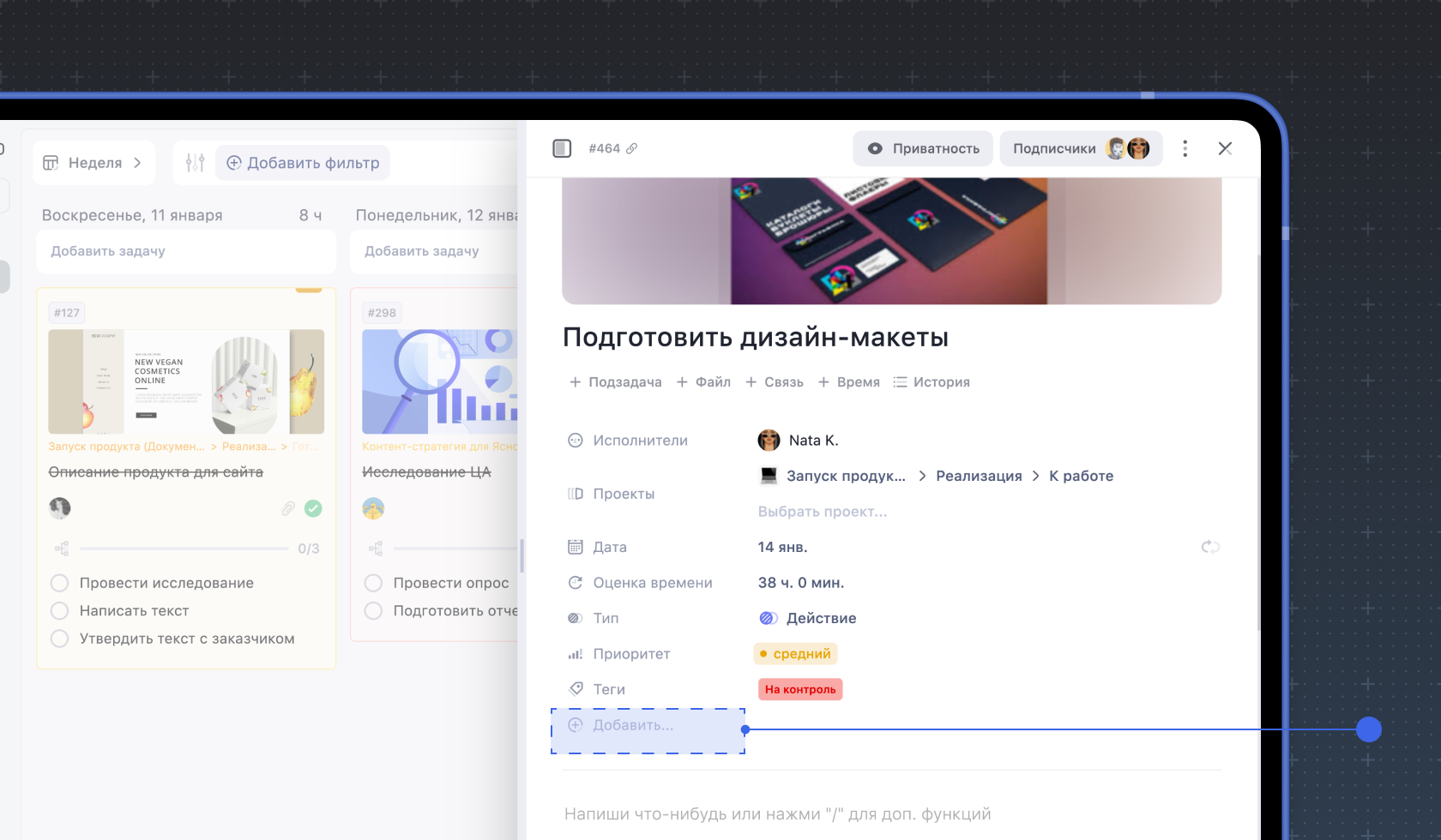 Чтобы создать кастомное поле, перейдите в карточку задачи и нажмите Добавить….
