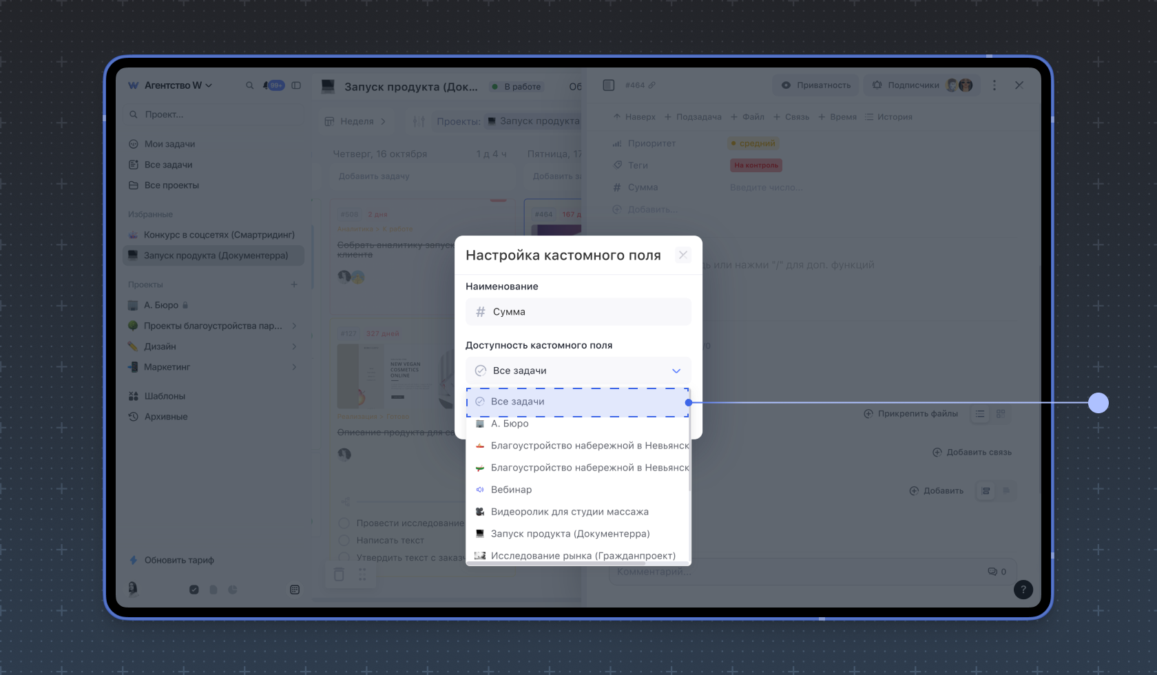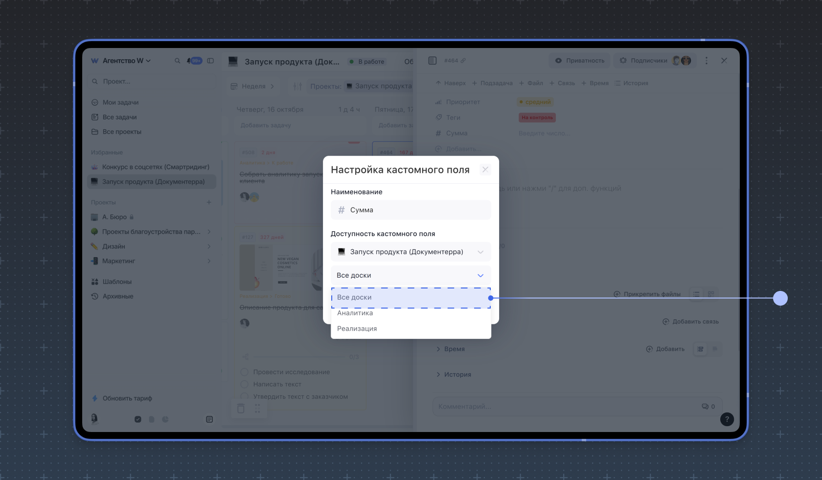 Доступность на уровне досок. Укажите проект и доску, для которой будет активно кастомное поле. Если оно нужно для всех задач проекта, выберите Все доски.