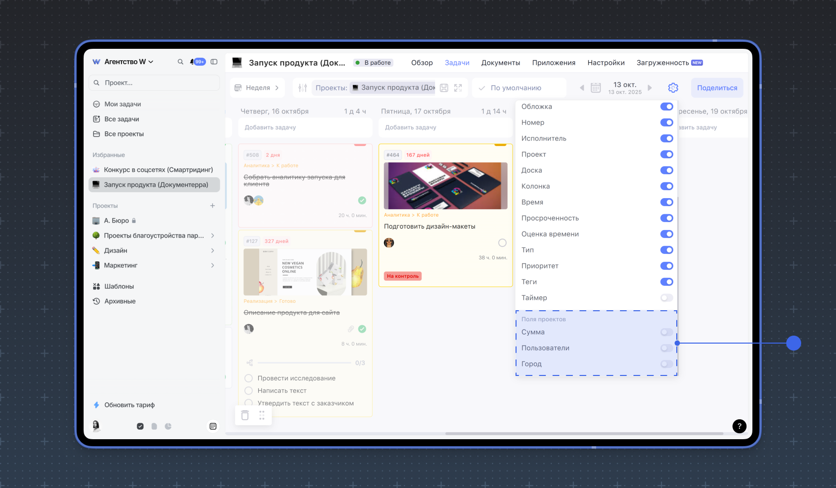 Чтобы кастомные поля отображались на карточке задачи, в разделе Поля проектов выберите нужные с помощью переключателей.