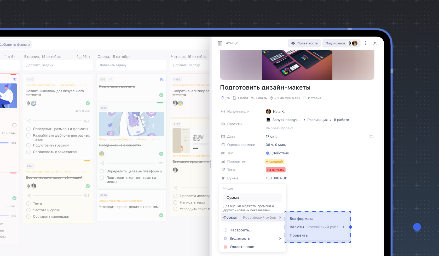 Чтобы задать формат числа, нажмите на кастомное поле, затем Формат и выберите формат числа: без формата, валюта, проценты
