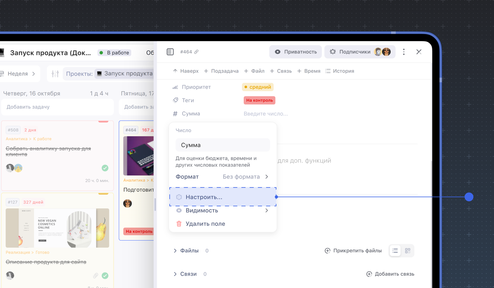 Чтобы настроить область работы кастомного поля, перейдите в карточку задачи и нажмите на название нужного кастомного поля. В выпадающем списке выберите Настроить.