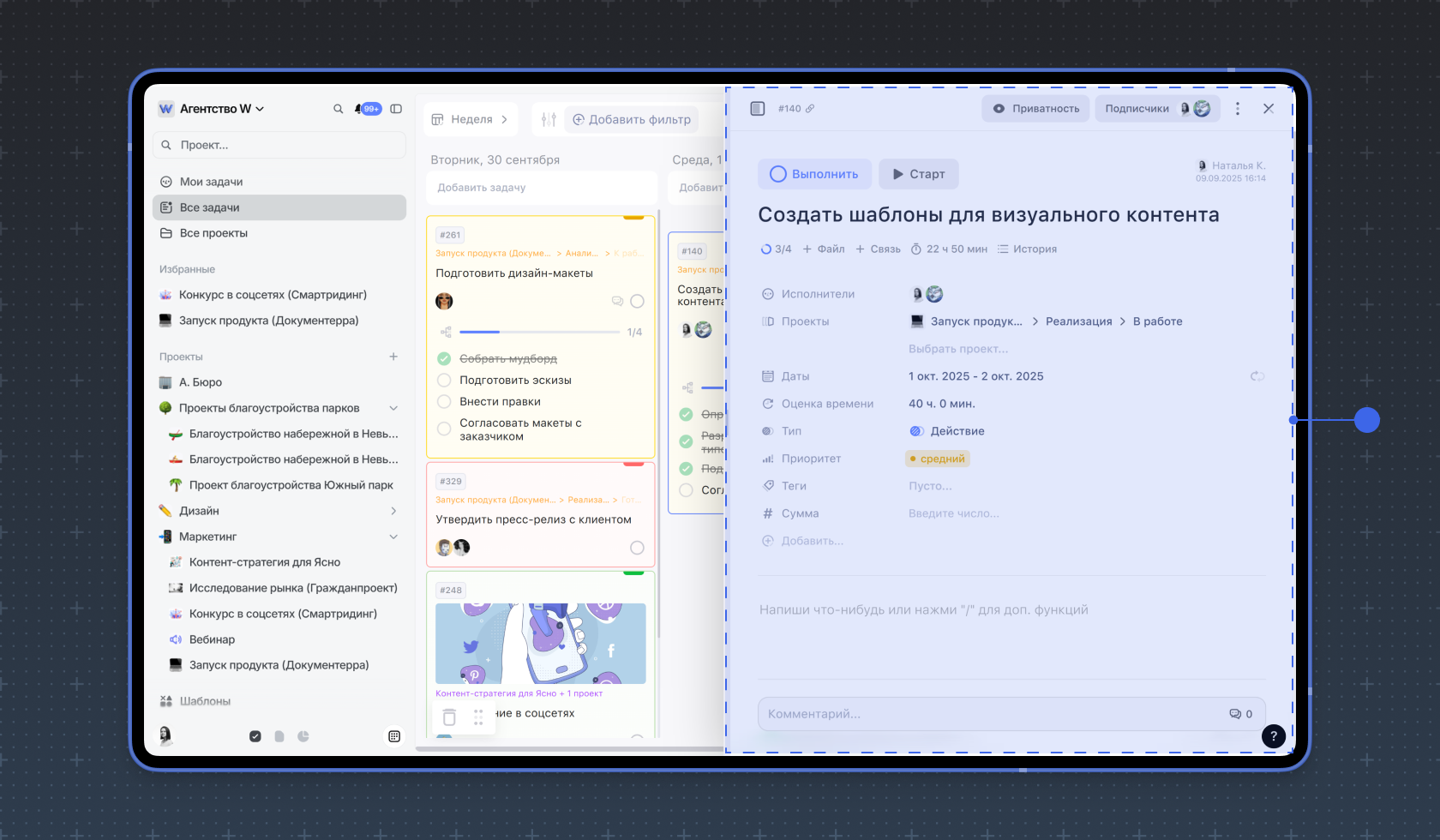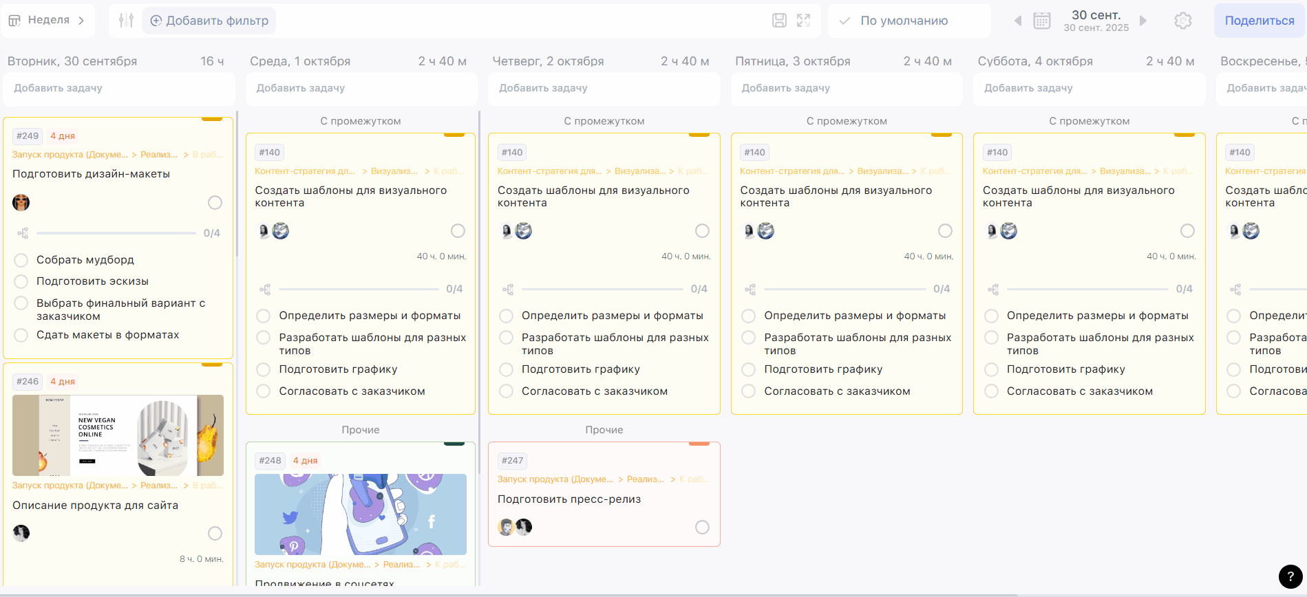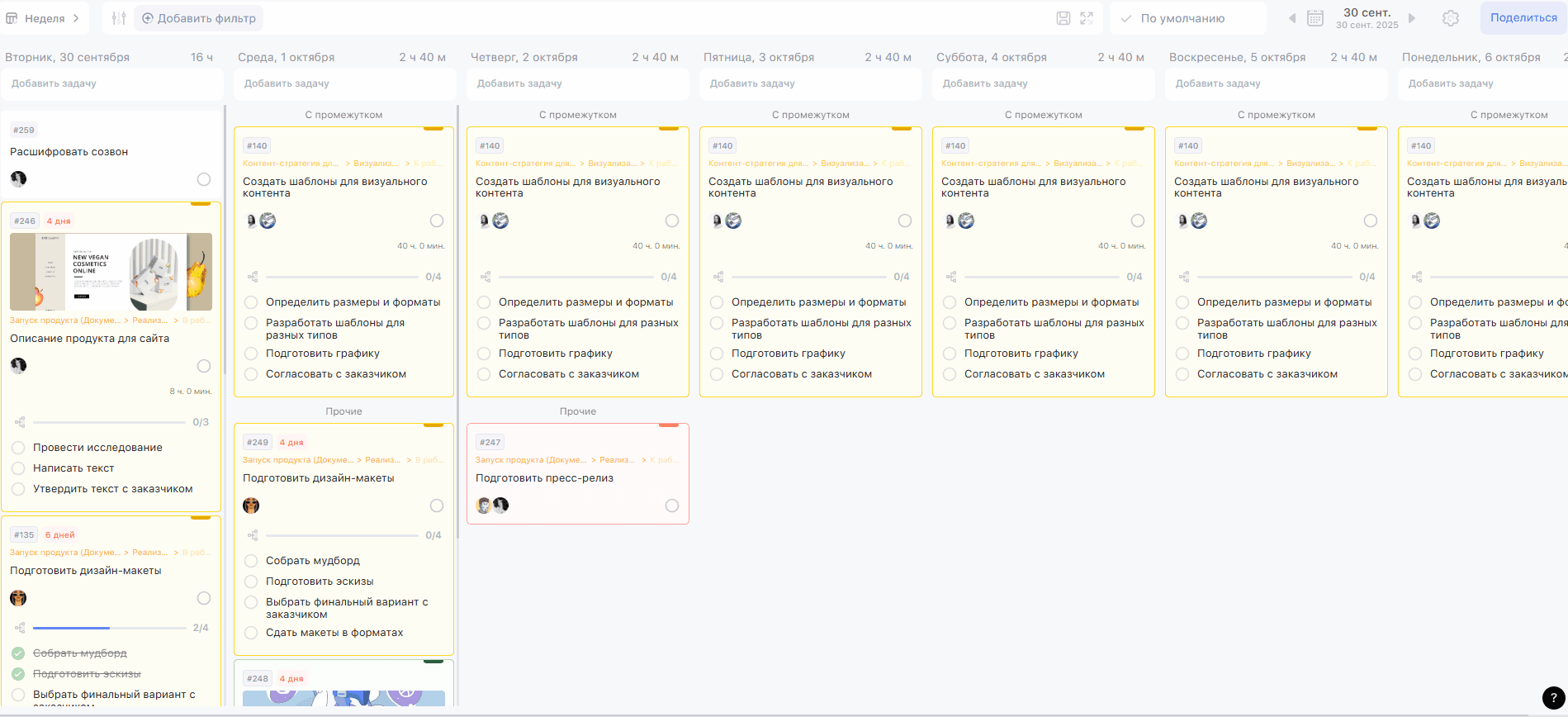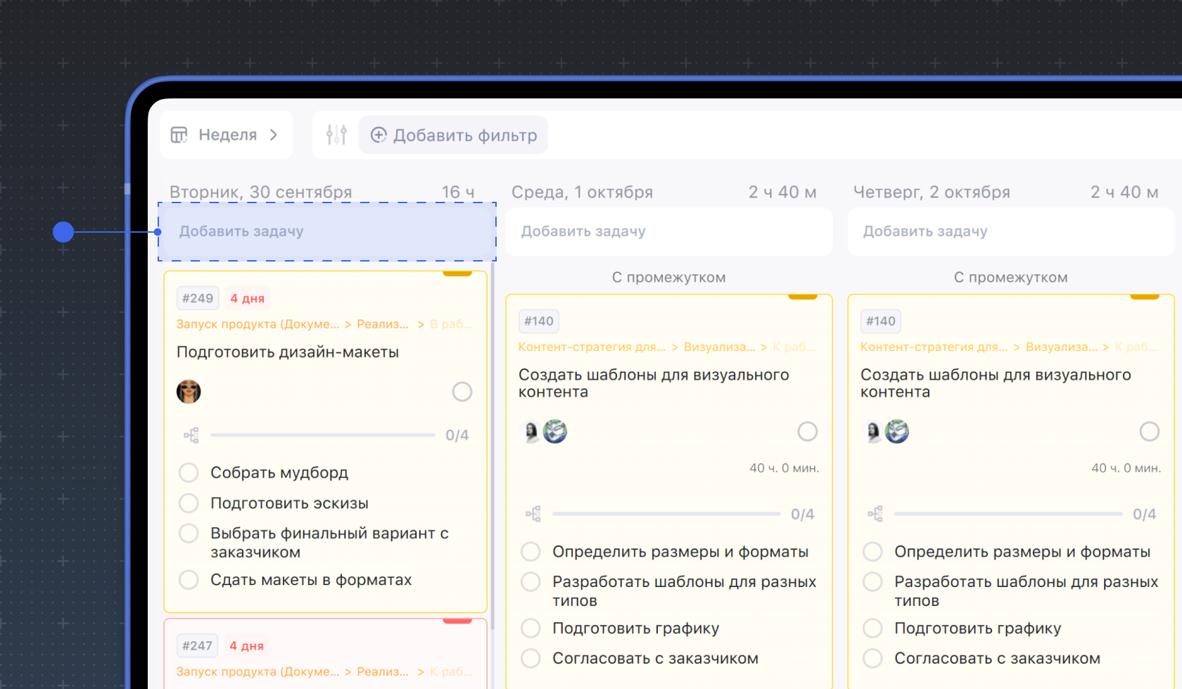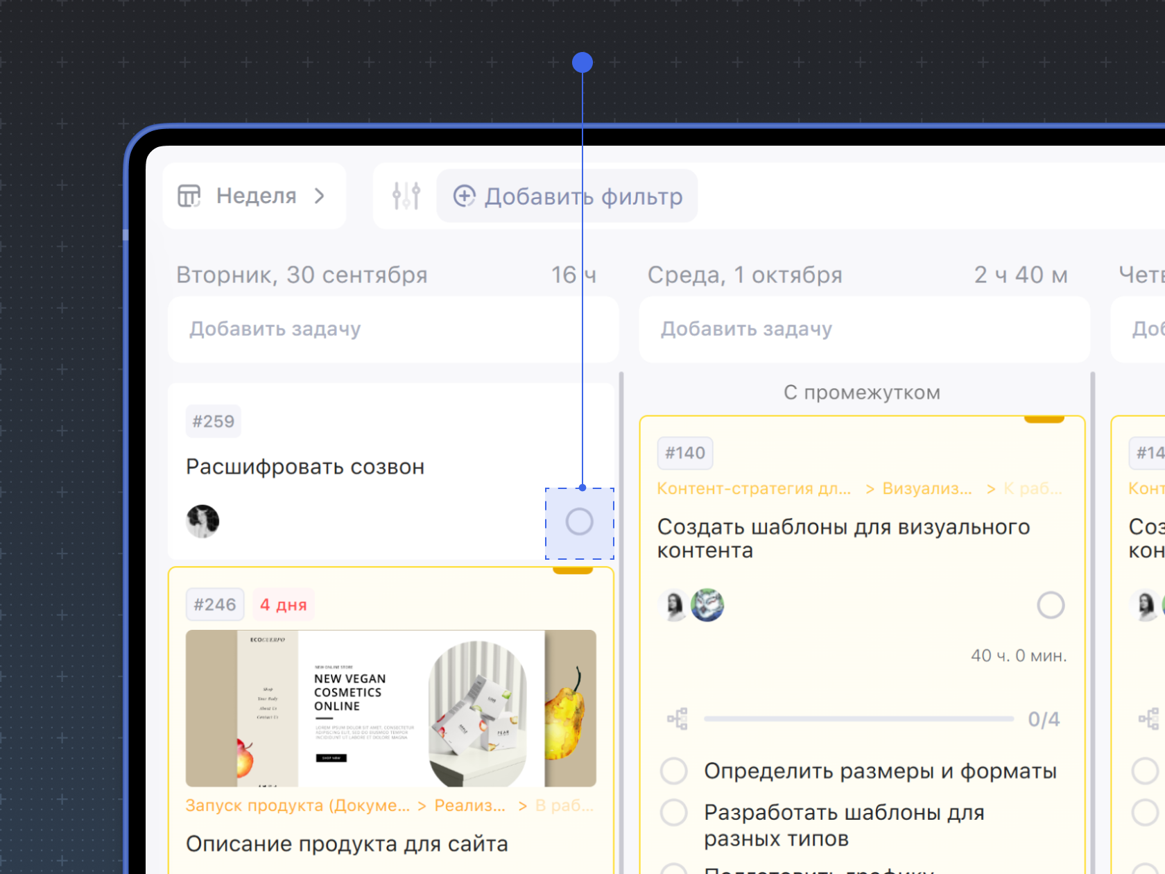 В режимах Неделя, Доски и Гант можно перемещать задачи между датами или статусами. Просто перетяните задачу в нужное место.