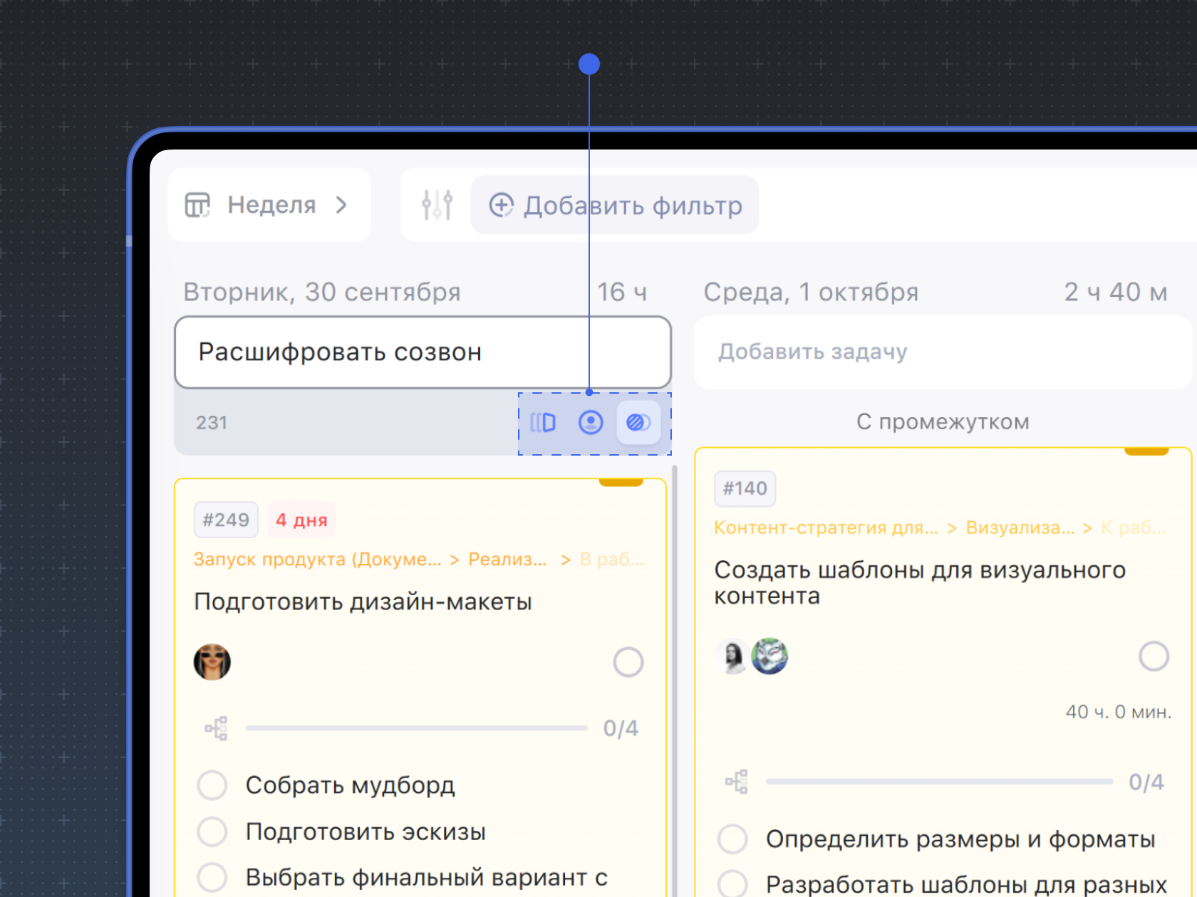 Задача — базовая единица таск-менеджера WEEEK; кирпичик, из множества которых состоит проект.
