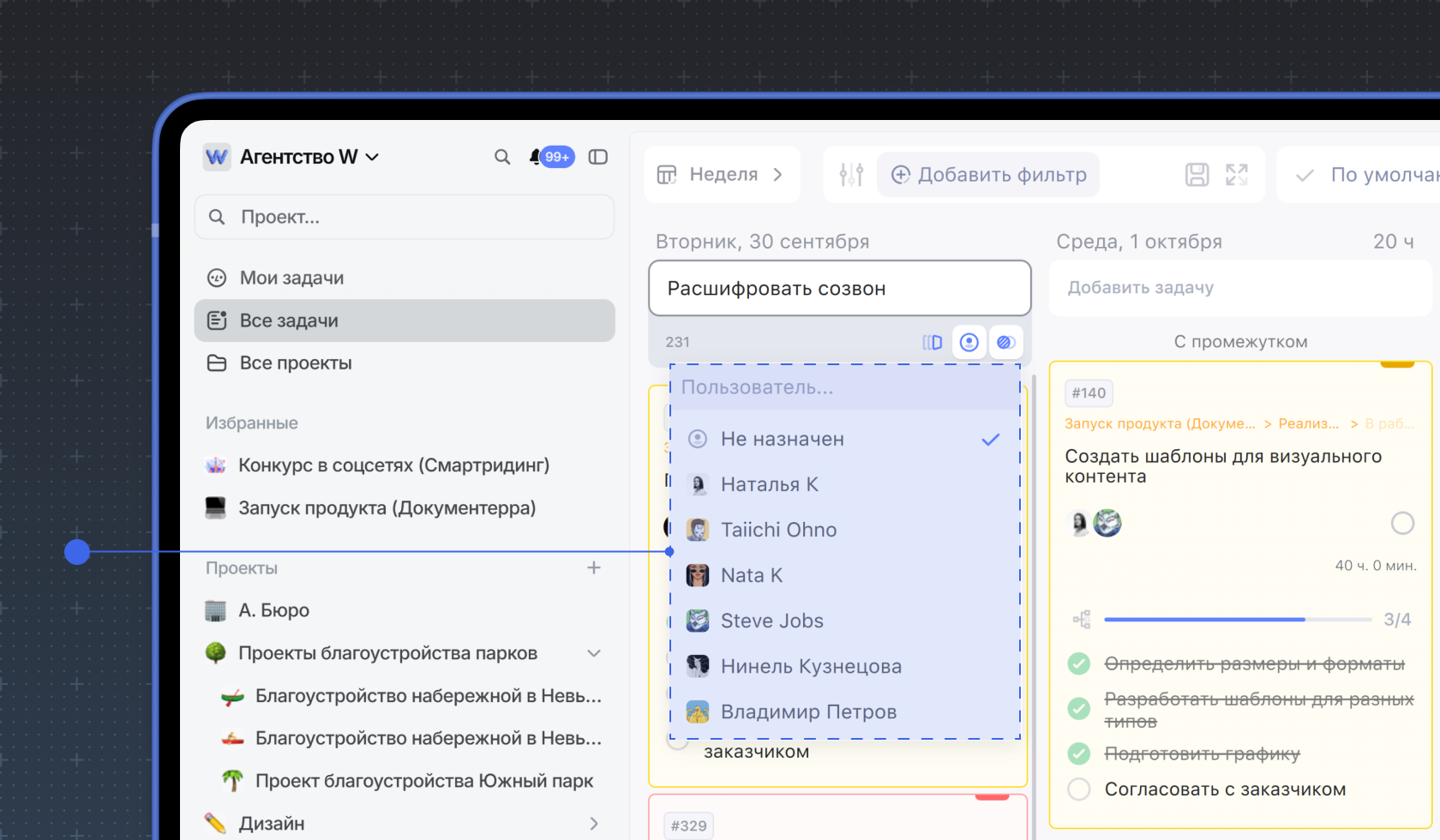 Чтобы назначить или сменить ответственного за задачу, нажмите на иконку человека или аватарку исполнителя и выберите нужного члена команды.