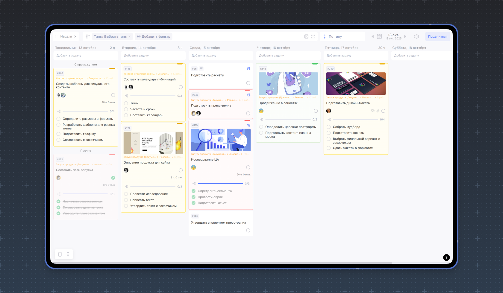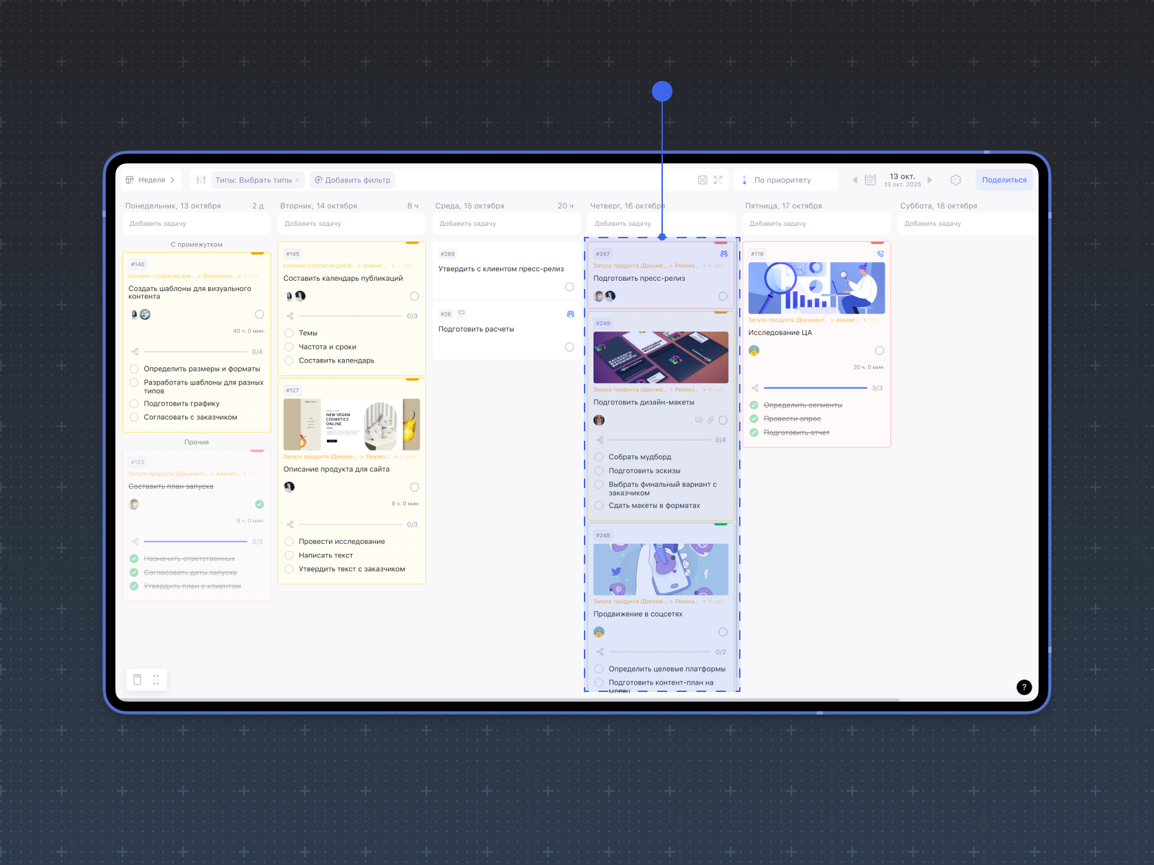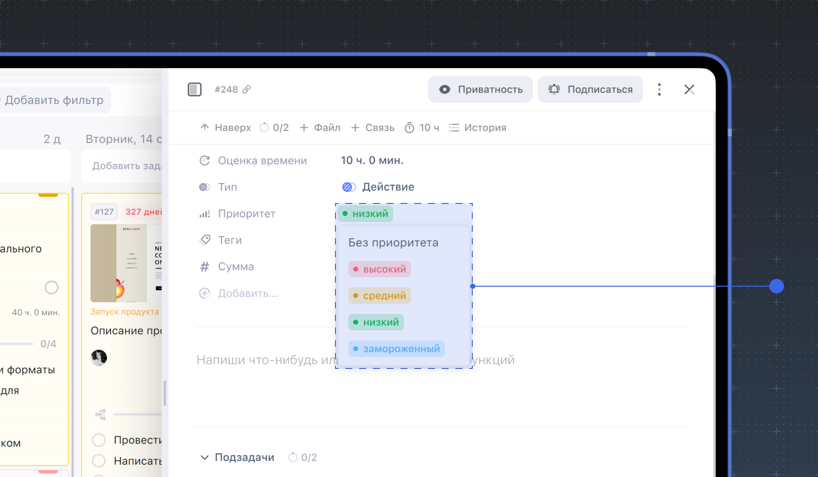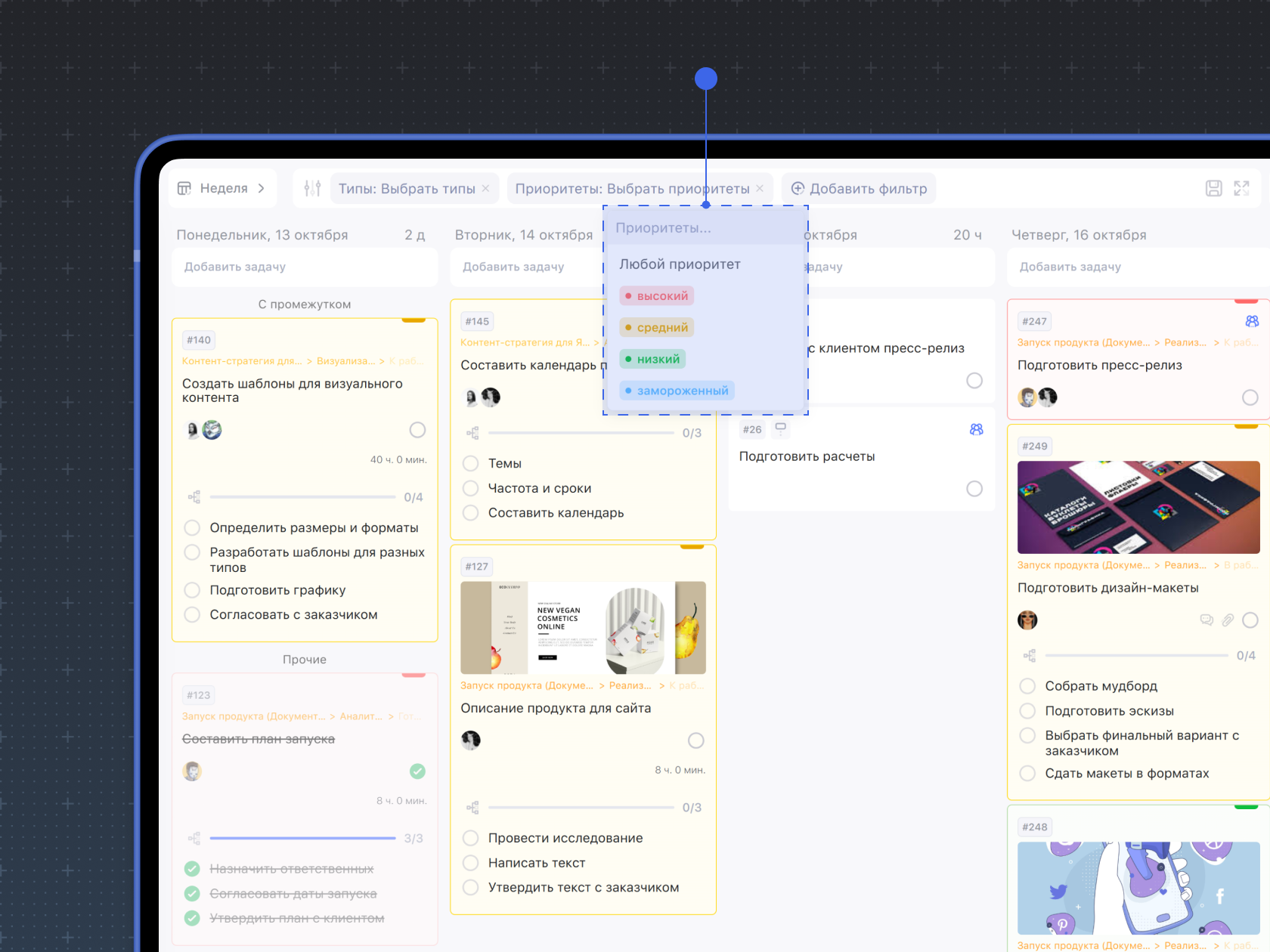 Чтобы эффективнее управлять делами и проектами, отмечайте важность задач — задавайте приоритеты. Для этого в Weeek существует приоритет: высокий, средний, низкий и замороженный. Выбор одного из них окрасит карточку задачи в красный, жёлтый, зелёный и синий цвет соответственно. Оставленная без приоритета карточка задачи останется белой.