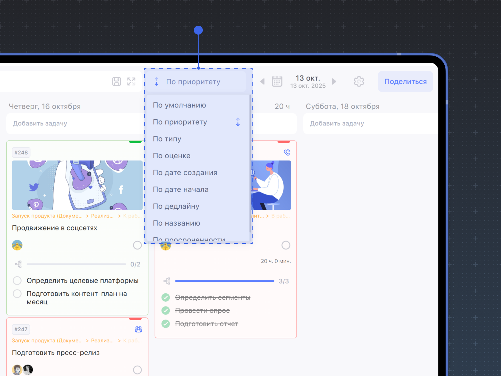 Задачи можно сортировать по приоритету. Для этого нажмите на кнопку сортировки в правой части панели над задачами и выберите По приоритету.