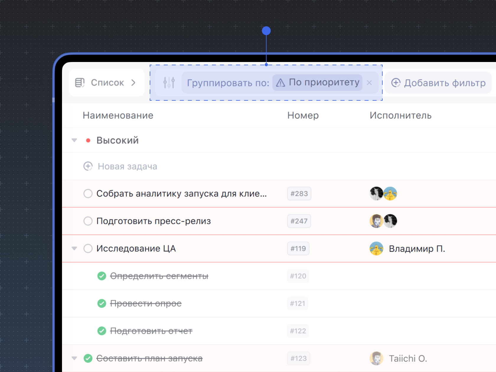 Задачи можно фильтровать по приоритету. Например, можно отобразить только важные задачи или замороженные.