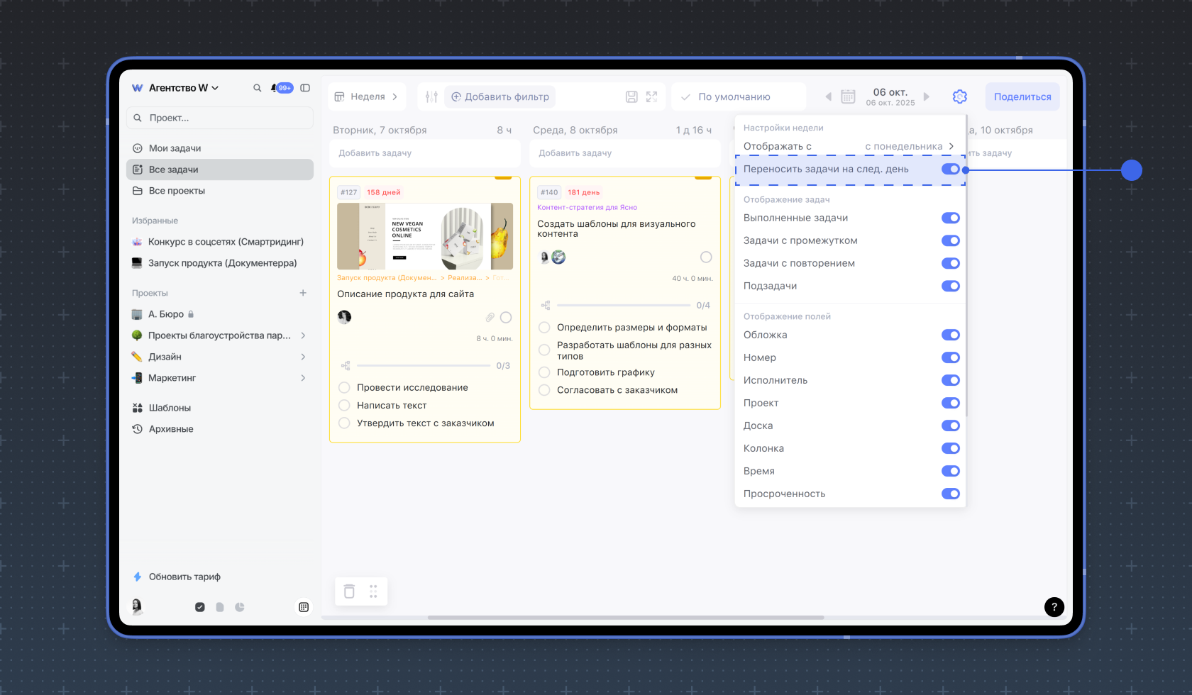 Чтобы включить перенос задач для своего аккаунта, в режиме Неделя выберите в настройках опцию Переносить задачи на след. день.