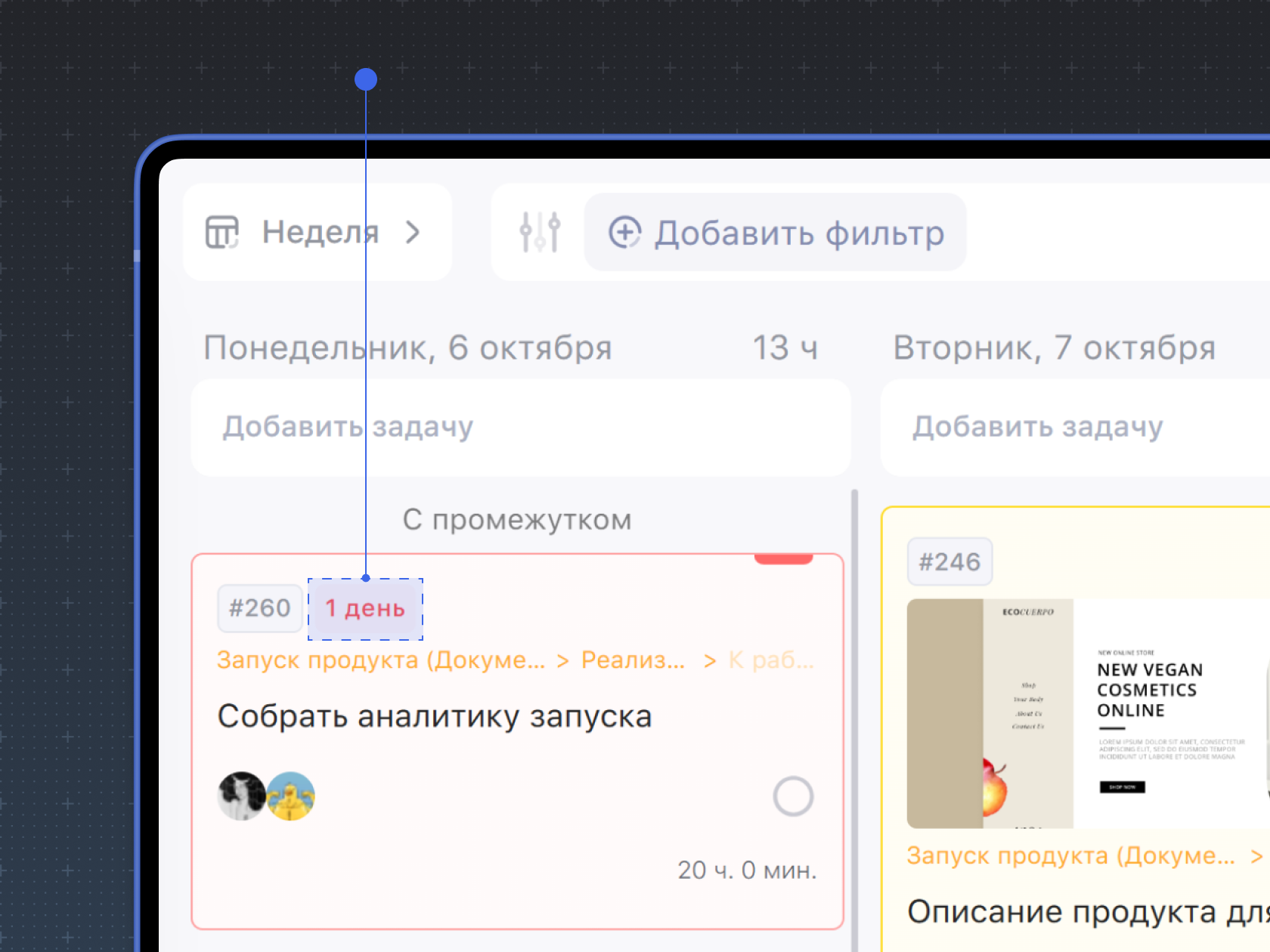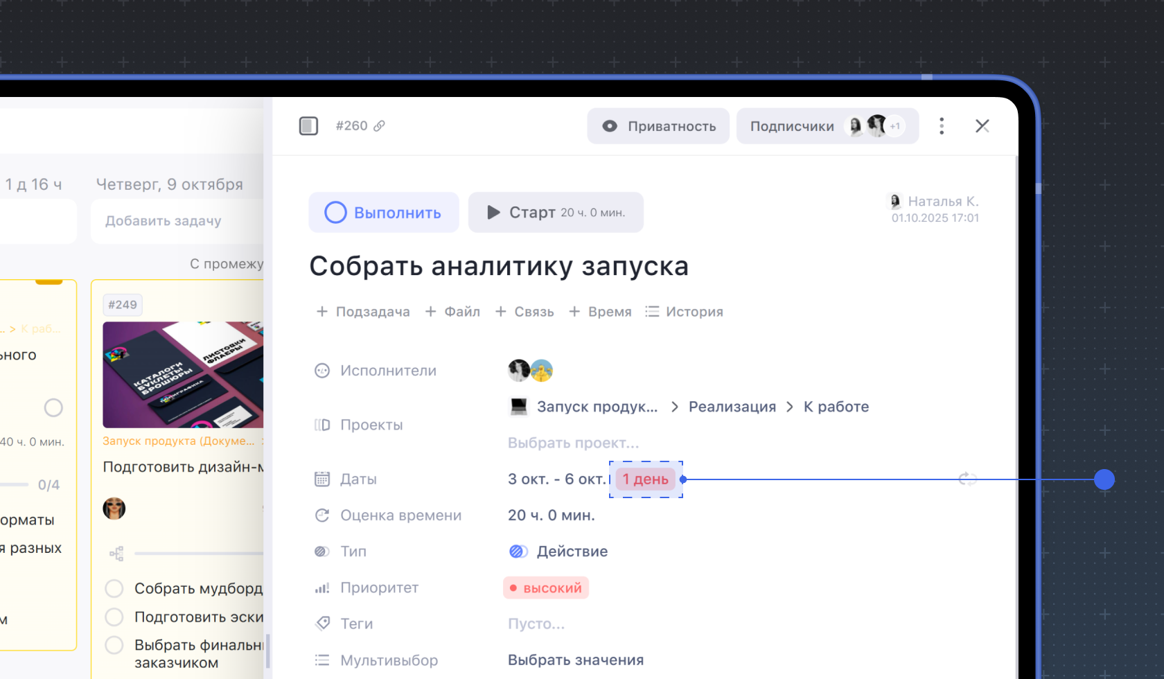 Просроченность задачи видна, если настроить автоматический перенос невыполненных задач на следующий день. Когда опция включена, каждый перенос невыполненной задачи на следующий день суммируется в счётчик просрочки и отображается внутри карточки задачи в поле Дата.