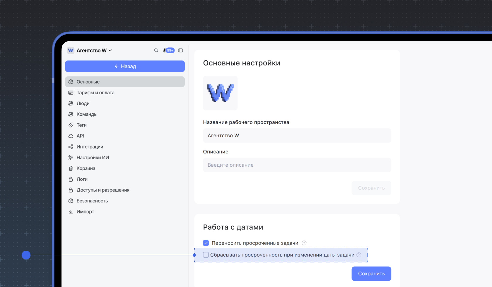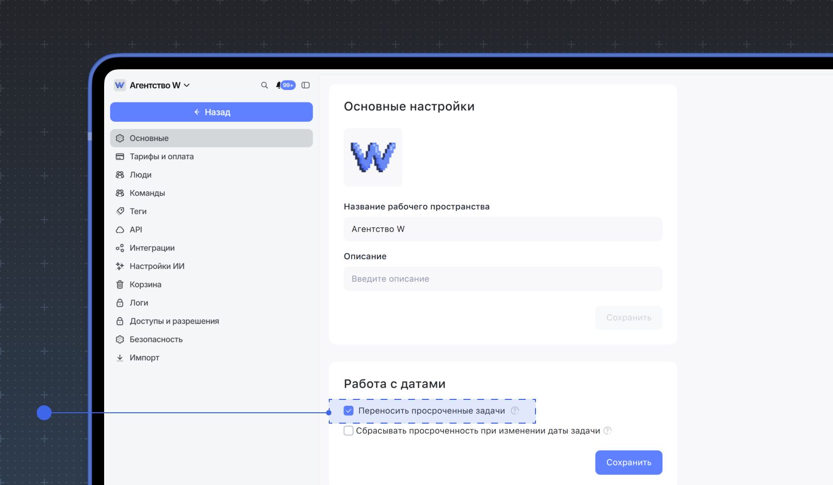 Можно настроить, чтобы просроченность задачи сбрасывалась при смене дедлайна. Для этого нажмите на название рабочего пространства в верхнем левом углу и выберите пункт Настройки. Нажмите Сбрасывать просроченность при изменении даты задачи, затем кнопку Сохранить.