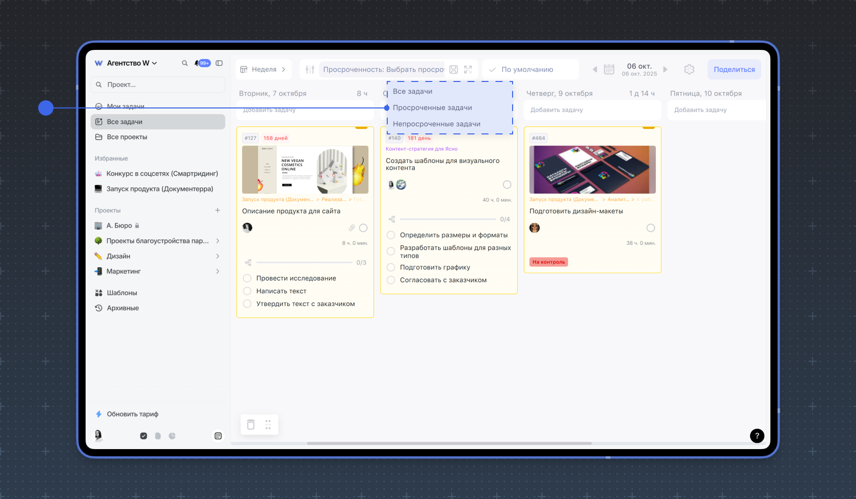- 2. Просроченные задачи. Чтобы увидеть только просроченные задачи
