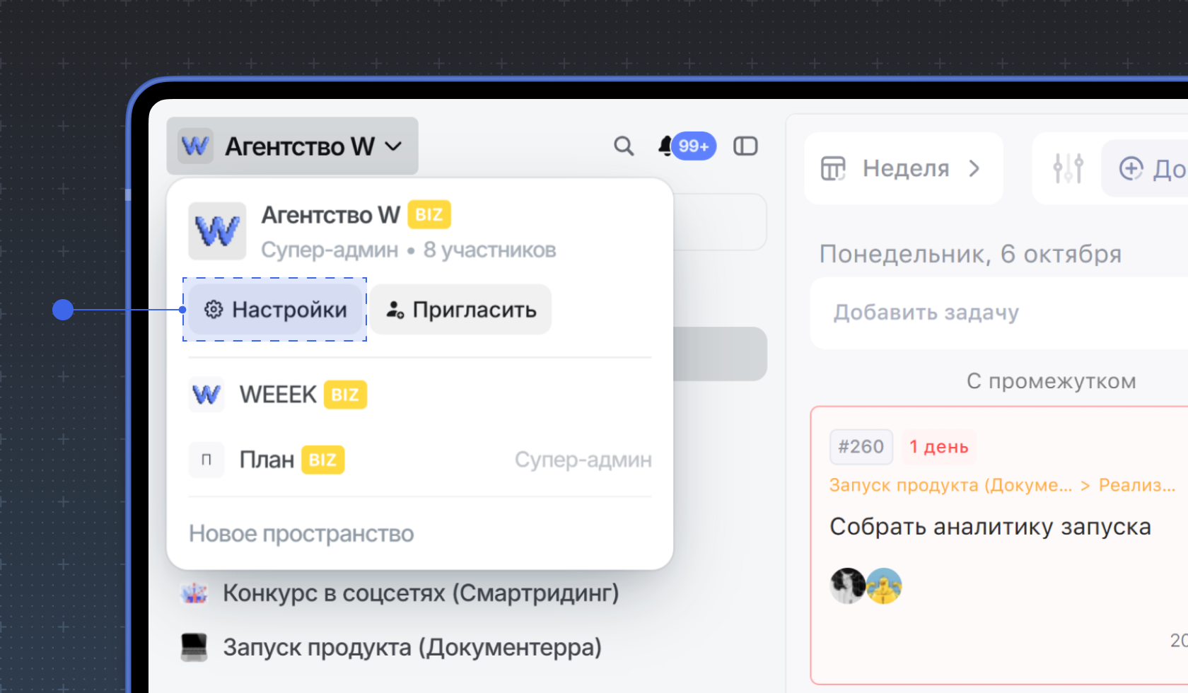 Чтобы включить перенос просроченных задач для всех пользователей внутри рабочего пространства, нажмите на его название в левой верхней части окна и выберите пункт Настройки.