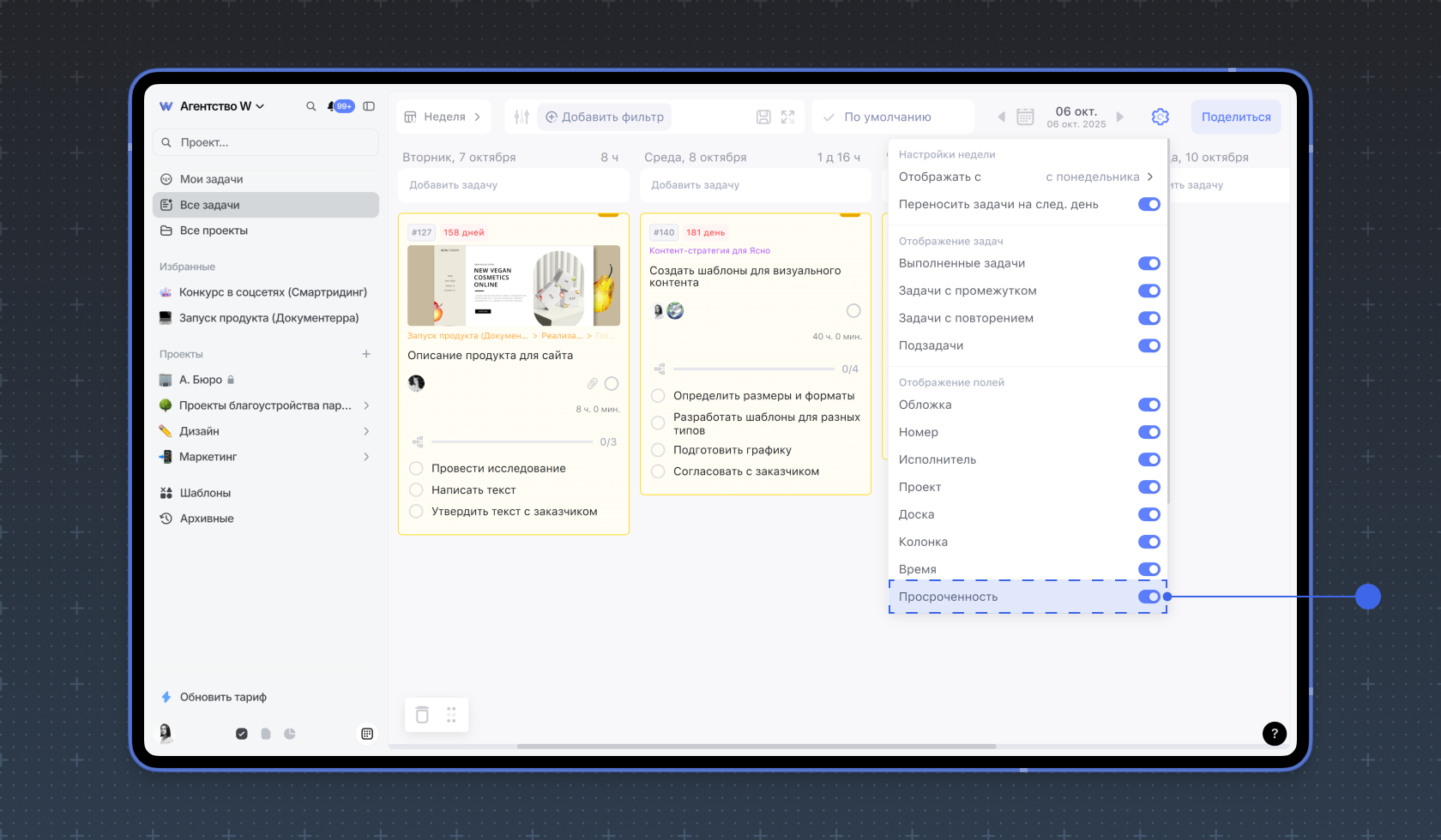 Вы можете показать или скрыть просроченность при просмотре задач режимах Неделя, Доски и Список. Для этого в настройках режима нажмите на переключатель Просроченность
