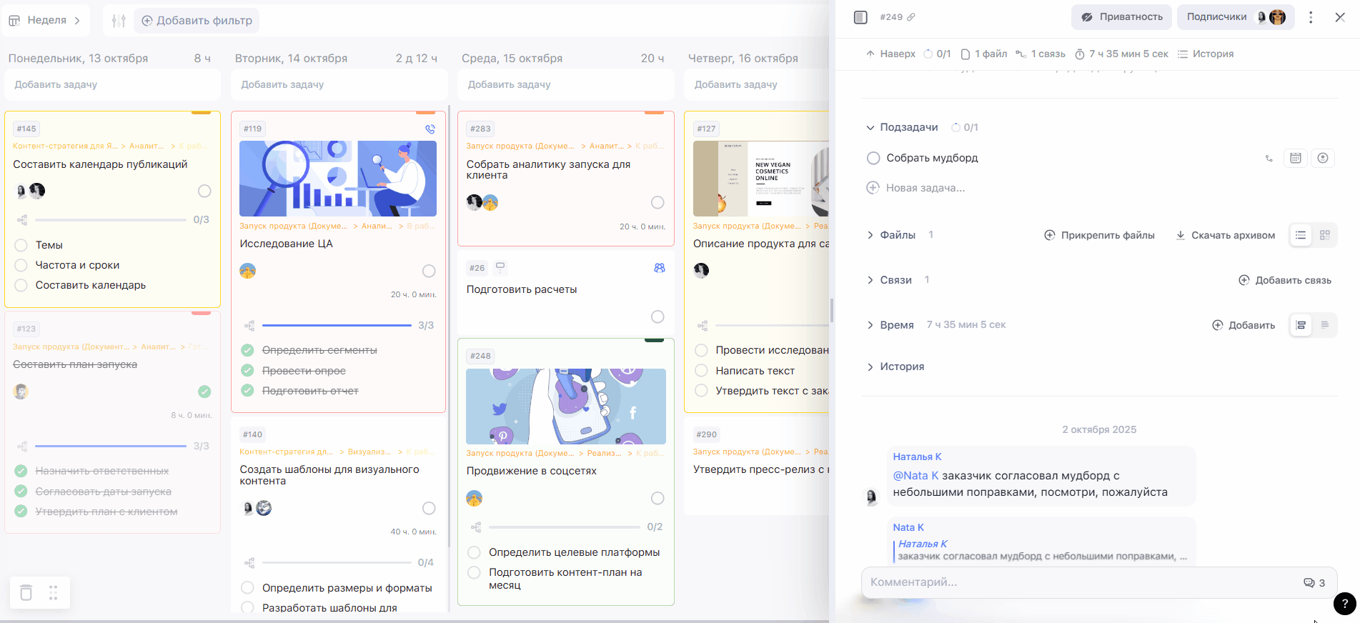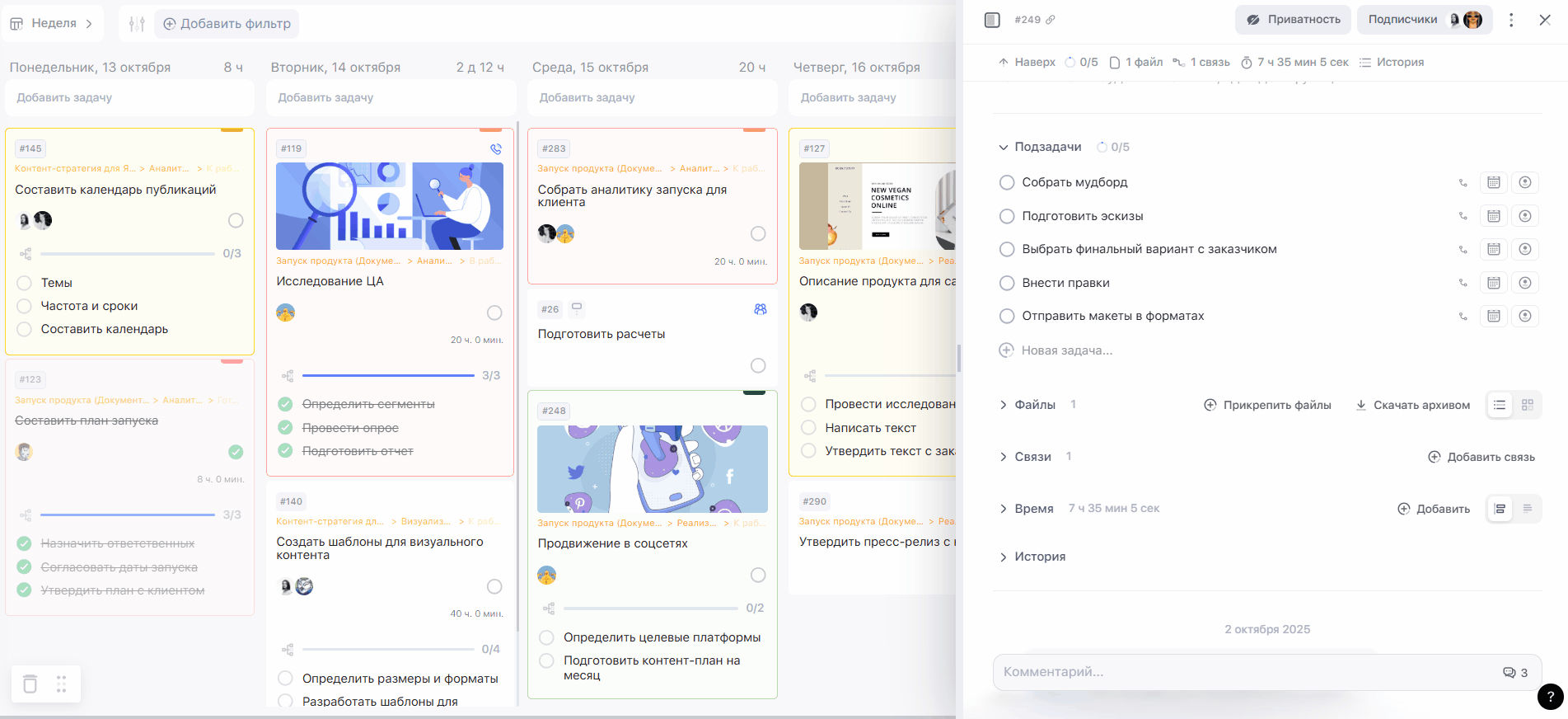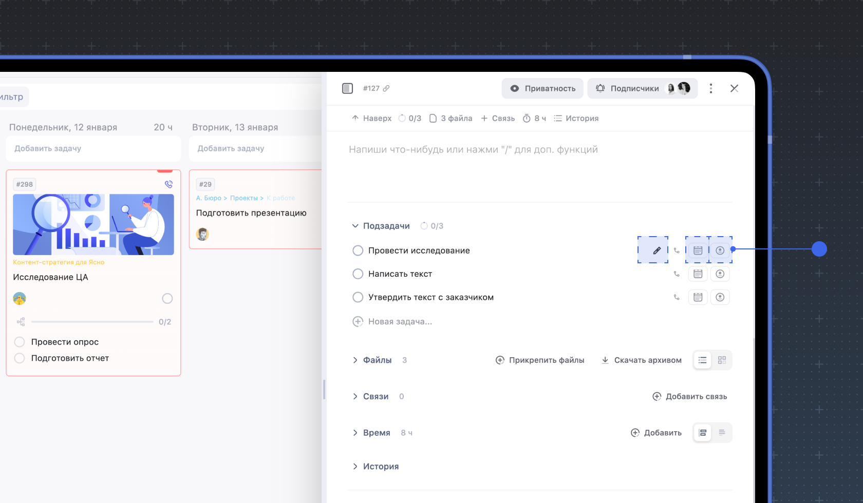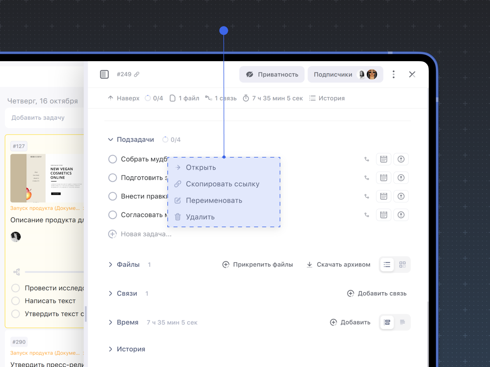 Каждая подзадача — это отдельная и самостоятельная задача. В ней можно добавлять описание, комментарии, прикреплять файлы, настраивать уведомления, а также фиксировать время работы.