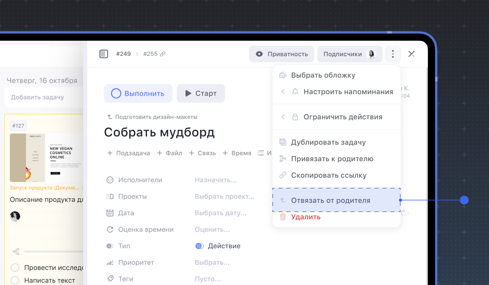 Подзадачу можно отвязать от задачи родителя. Для этого внутри карточки подзадачи нажмите на три точки в правом верхнем углу. В открывшемся меню выберите на Отвязать от родителя и подтвердите действие.
