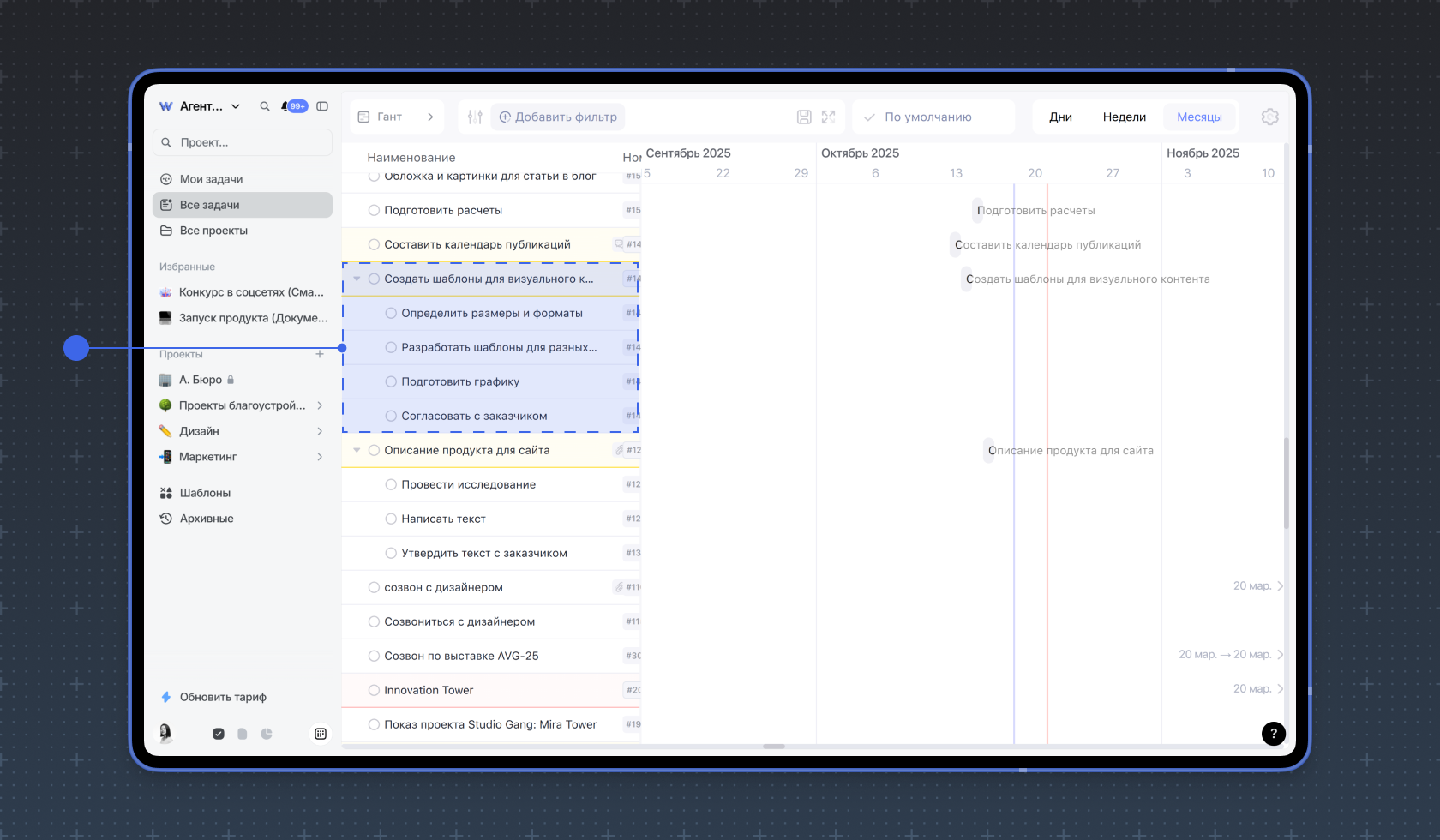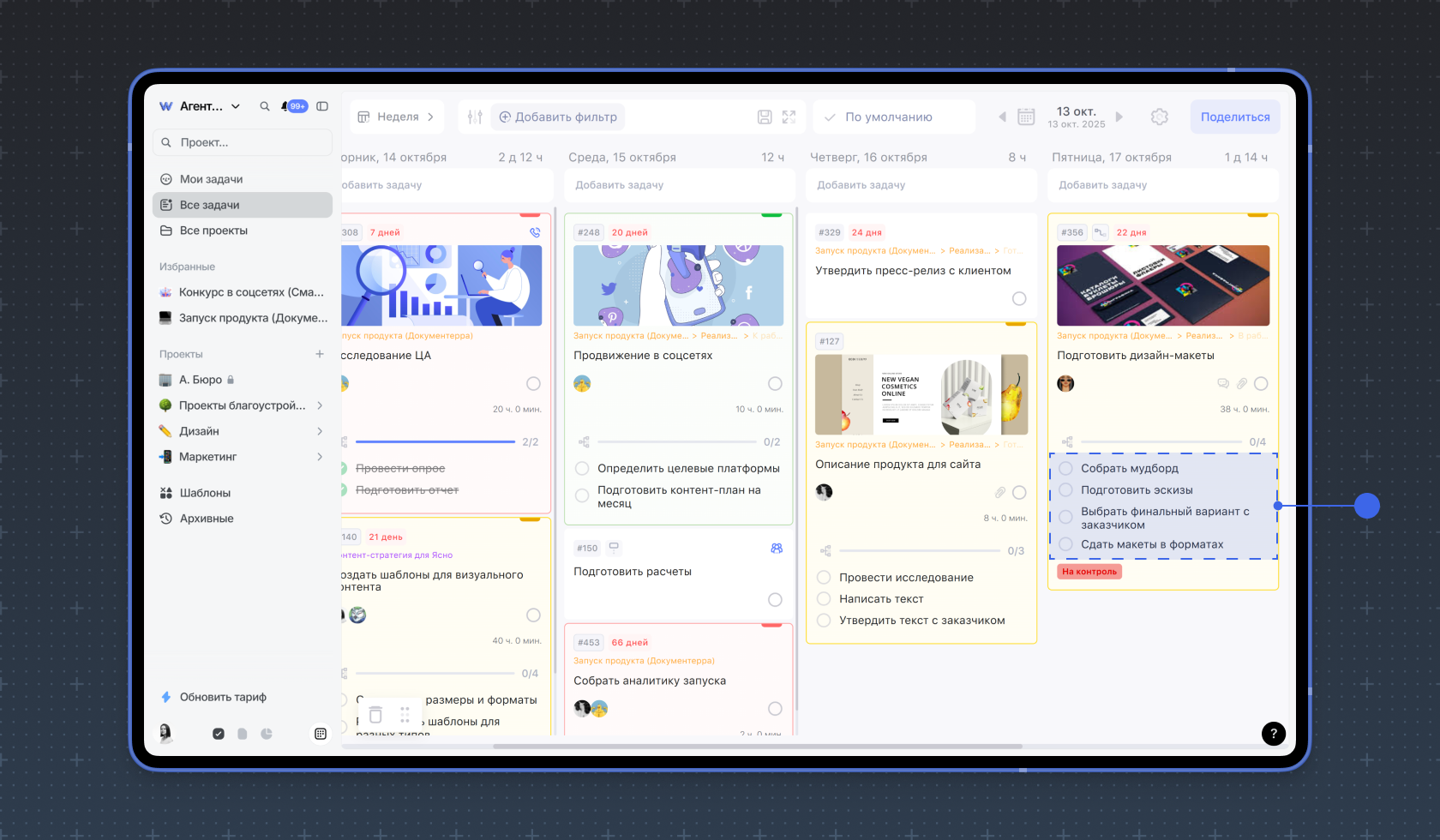 Подзадачи в WEEEK — это не просто чек-листы, а полноценные задачи, обладающие теми же свойствами, что и обычные. Они помогают декомпозировать этапы работы, подробно описывать шаги и контролировать прогресс их выполнения. Подзадачам можно назначать исполнителя, дату, проект — все атрибуты обычной задачи.