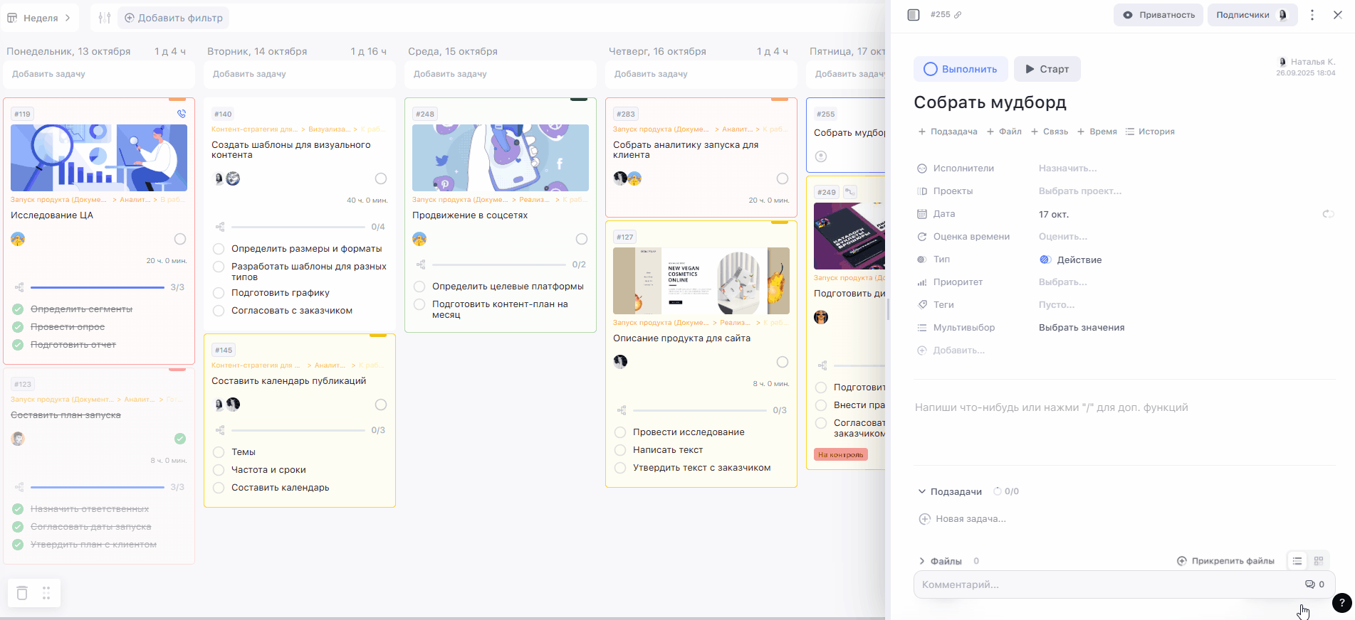 При создании подзадача размещается только в карточке родителя и работает как часть её чек-листа. В режимах просмотра Неделя, Доски, Список и Гант она отображается как пункт из списка внутри родительской задачи.