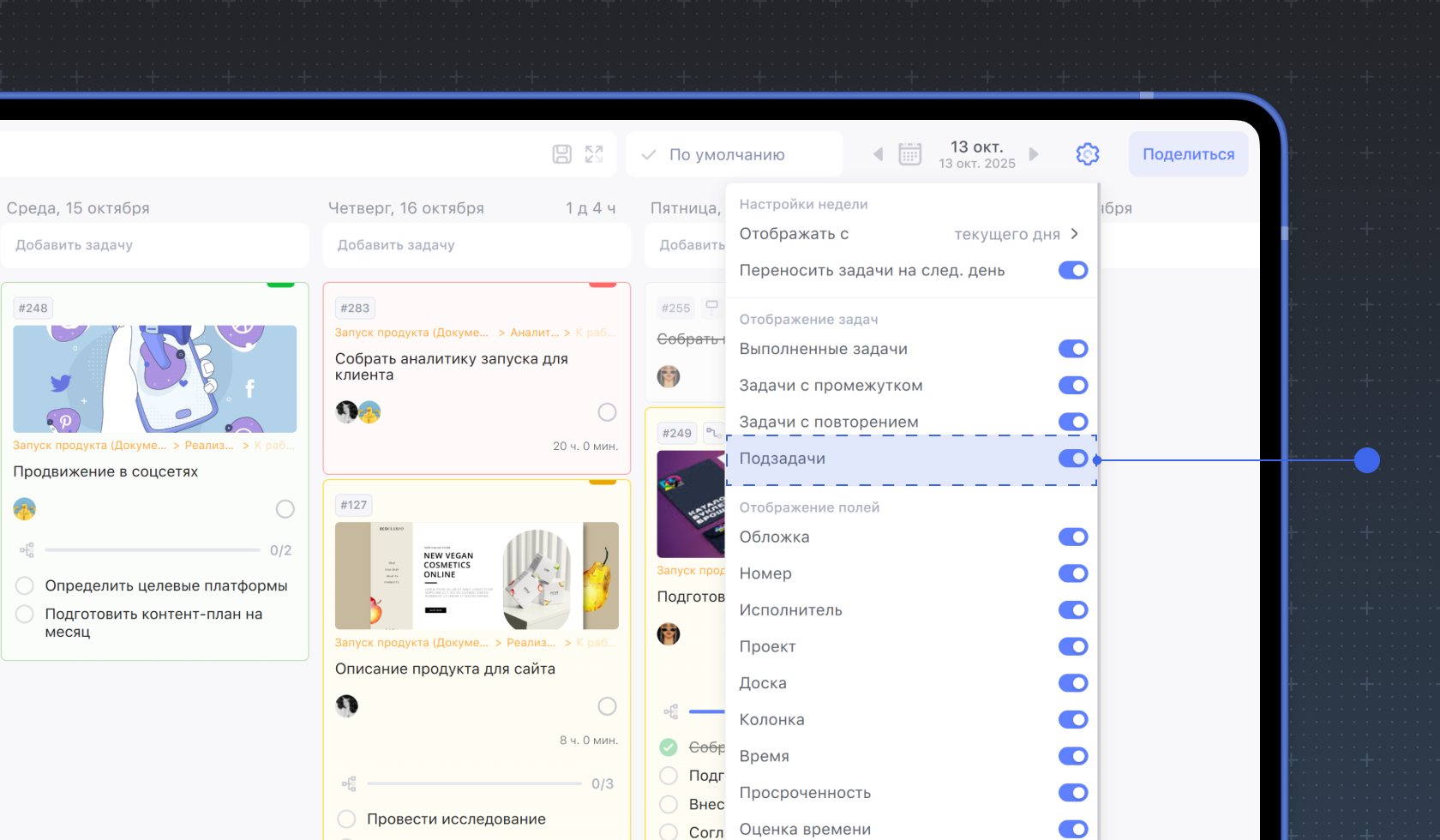 Подзадачи можно скрыть, чтобы они не отображались в режимах просмотра Неделя и Список. Чтобы скрыть подзадачи, зайдите в настройки рабочего пространства и сделайте неактивным переключатель Подзадачи.