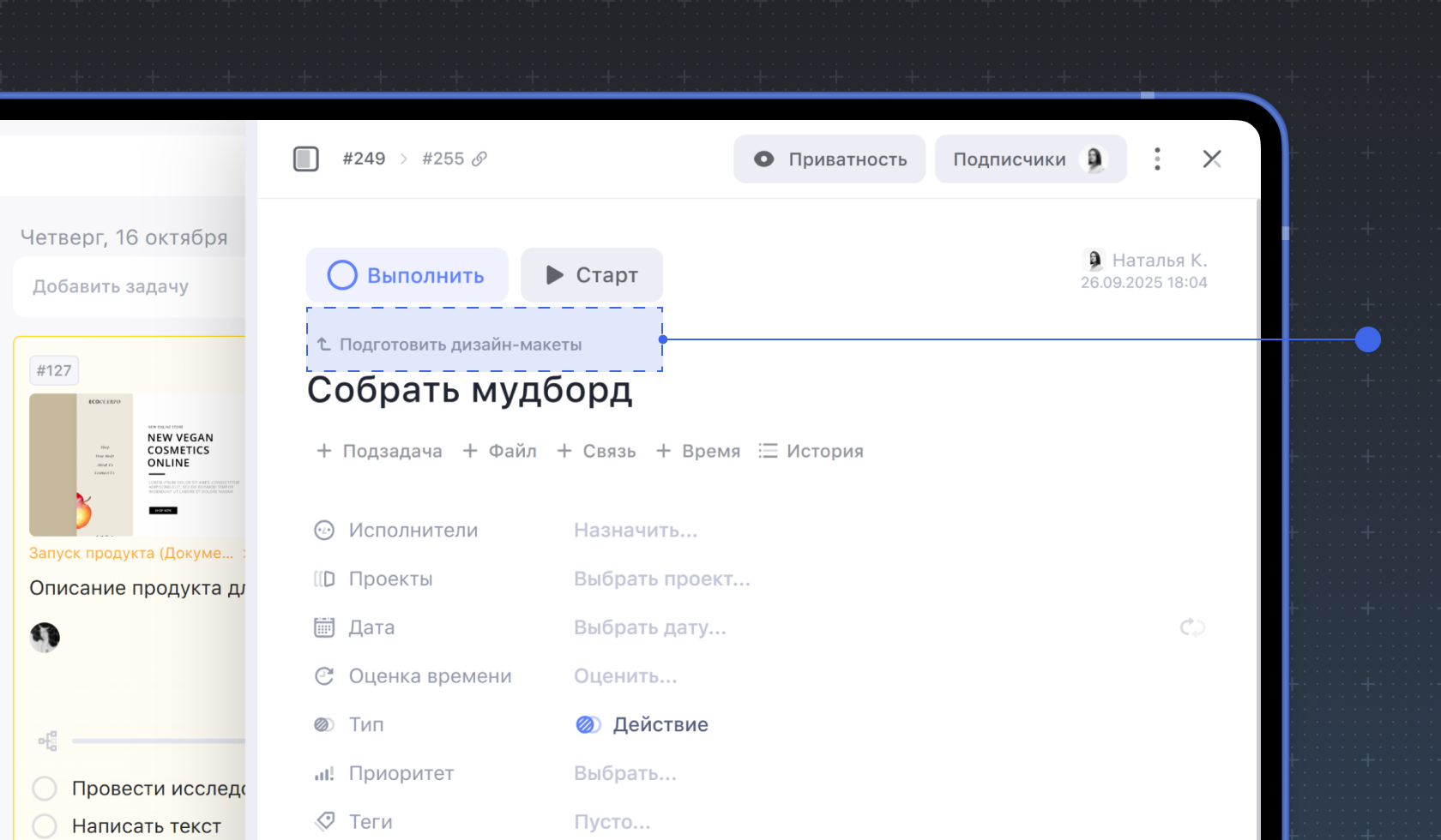 Чтобы добавить подзадачу, внутри карточки родительской задачи перейдите на вкладку Подзадачи и нажмите Новая задача. Введите название подзадачи и нажмите Enter.